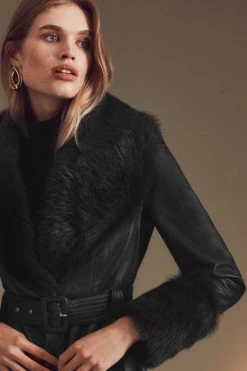 Karen Millen Shearling Cuff & Collar Leather Coat