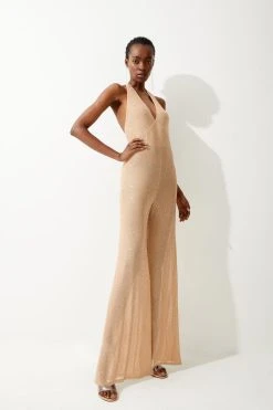 Karen Millen Hotfix Halterneck Wide Leg Jersey Jumpsuit