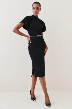 Karen Millen Belted Angel Sleeve Viscose Blend Jersey Midi Dress
