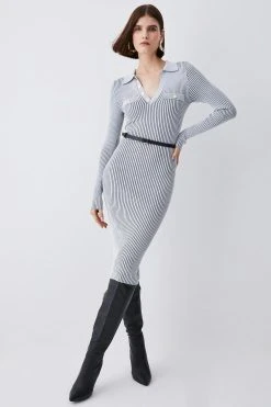 Karen Millen Buttoned Collar Stripe Viscose Blend Knitted Midi Dress