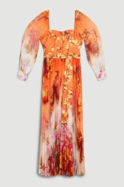 Karen Millen Golden Floral Satin Pleated Woven Maxi Dress