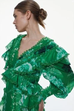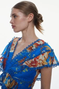 Karen Millen Graphic Lace Trim Floral Woven Plunge Maxi Dress