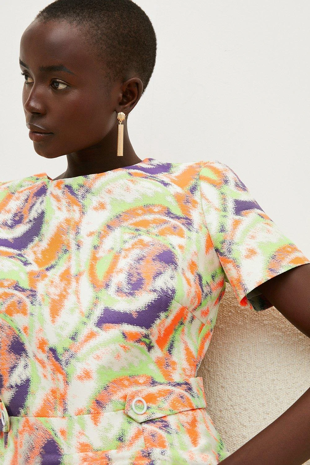 Mirror summer’s fresh colour palette in this abstract-print peplum-hem mini dress. Cut to a clean-lined fit with short sleeves and a round neckline, it shows off vibrant swirls of colour trimmed with belted detailing framing the waist. Pick out the pastel tones with coordinating colour-pop heels and gleaming gold jewellery.