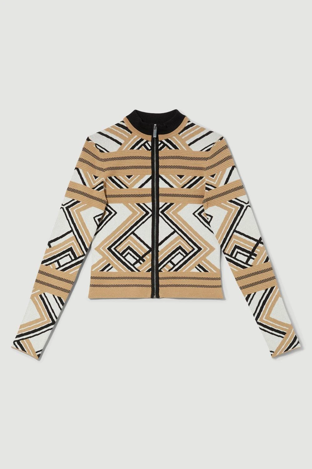 This knit cardigan is defined by a bohemian-style chevron pattern. A front zip closure adds a practical touch, while a neutral palette exudes classic appeal.