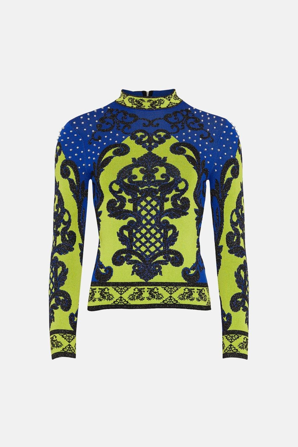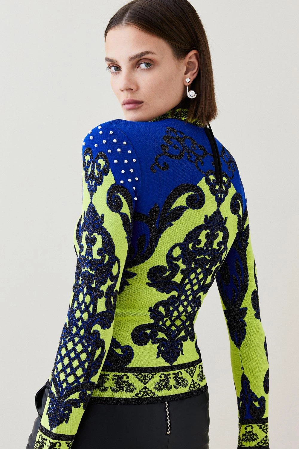 Dress up plain separates in seconds with this slinky jacquard knit top. Defined by its bold Baroque print and tight fit, it lends the perfect amount of dressed-up polish to after-work drinks or flirtatious date nights.
