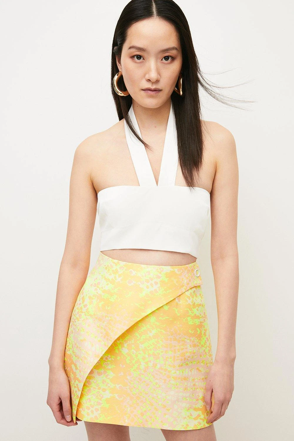Nothing lengthens legs quite like this modish animal jacquard mini skirt. Detailed with a wrap-over front and simple press buckle closure, it breathes new life into your skirt collection and has a retro, 1960s-inspired vibe. Trimmed with a concealed zip at the back, it looks effortless styled with a form-fitting vest top and chunky platform heels.