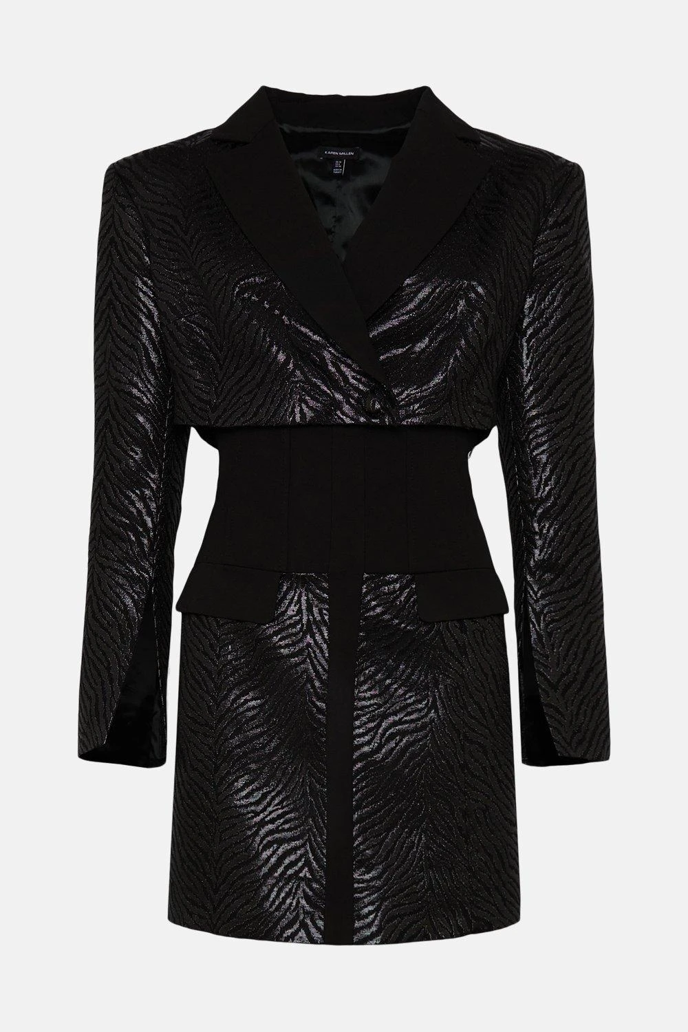 Made for modern dressers, this statement blazer dress shows off a cropped, boxy top half complete with contemporary split cuffs. Contrasting with the voluminous sleeves, our designers have created a corset-style skirt that gently sculpts curves. A truly directional design, offset the tonal animal-print jacquard motif with chunky black heels and gleaming gold jewellery.
