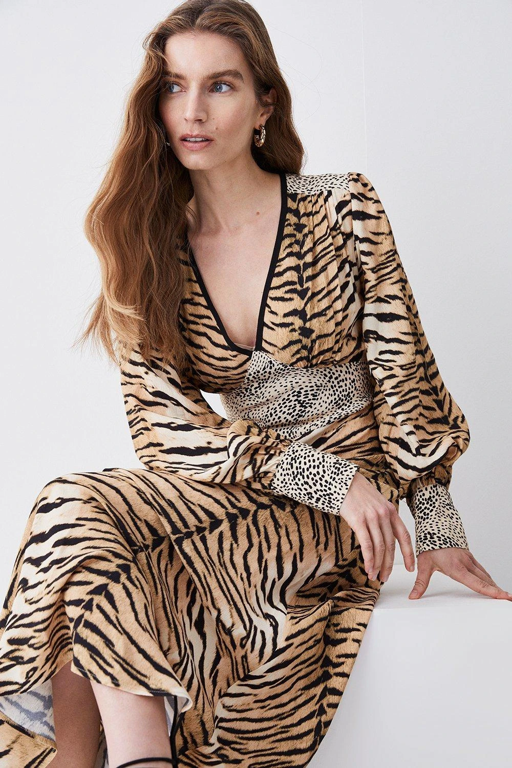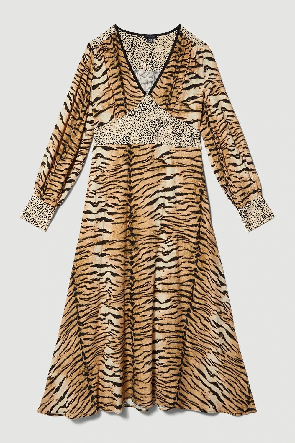 Showcasing an intricate mixture of animal prints, this mini dress makes an instant statement. The fluid silhouette is cinched at the waist to accentuate the form. The flowing skirt grazes the ankles, adding elegant appeal to this warm-weather piece.
