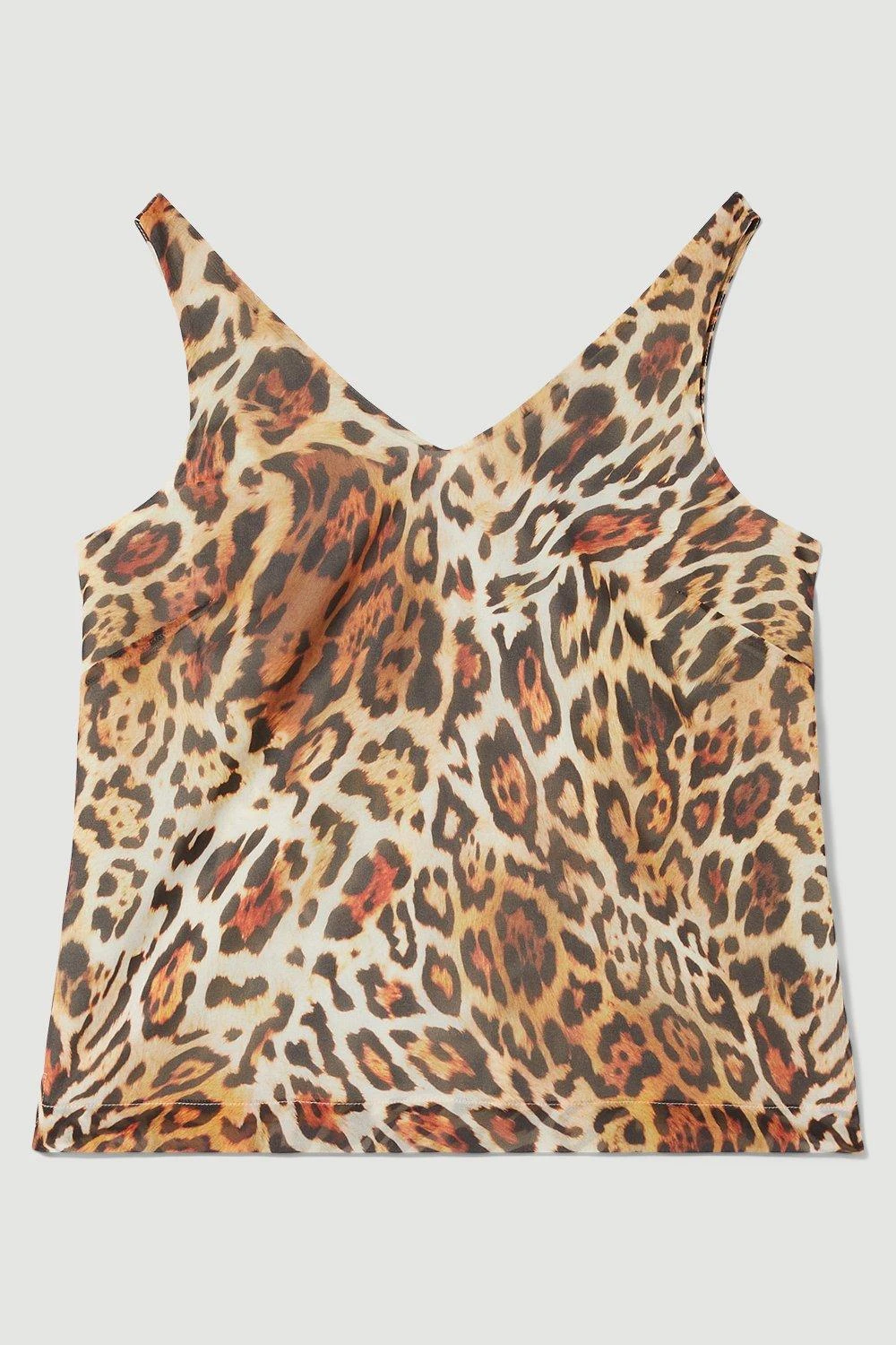 This forever-flattering soft woven top is crafted in a cami design, ensuring easy styling throughout every season. This iteration is designed with a playful leopard print.