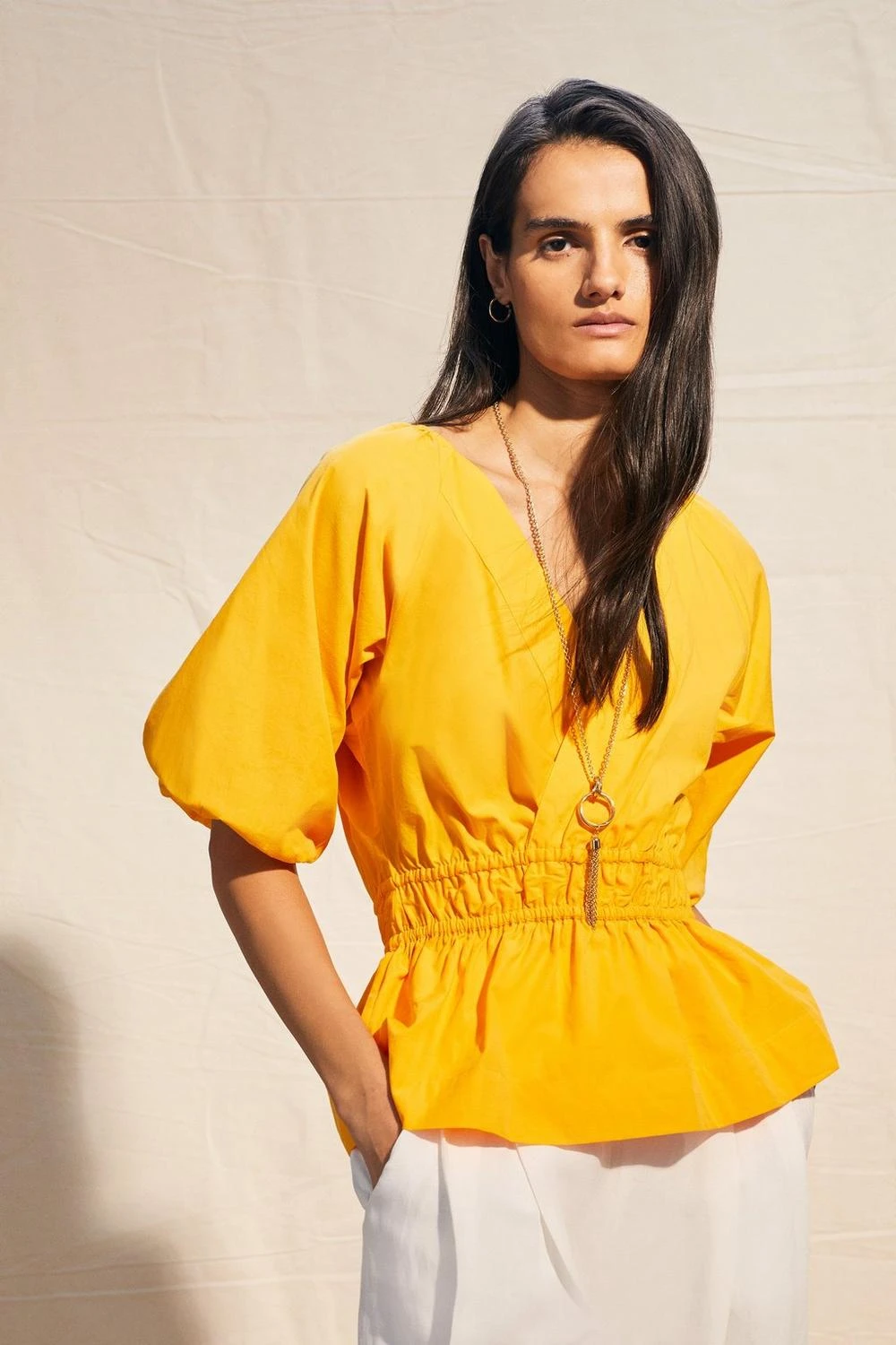 A summer essential with elegant appeal, this cotton blouse elevates the everyday. Balloon sleeves complement a peplum design to create a flattering silhouette, while soft cotton material ensures comfort throughout warmer climes.