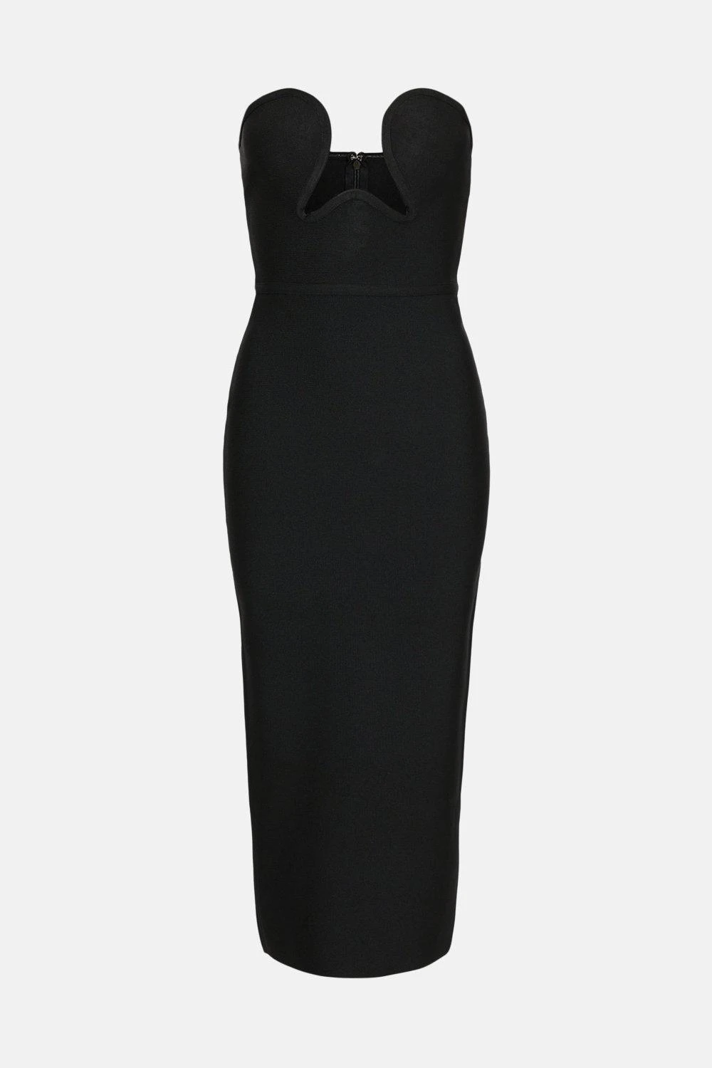Composed with artful curving lines, this corset midi dress is defined by a cinematic curved neckline. Easing into the contouring composition of a bandage pencil silhouette, pair this piece with soaring stilettos.