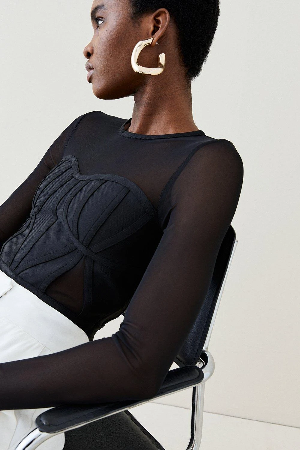 Moulded to the form with tactile mesh, compose a statuesque silhouette in this corset-inspired top. Nodding to this season’s penchant for lingerie design, it’s guided by tonal piping to create a cinched profile.