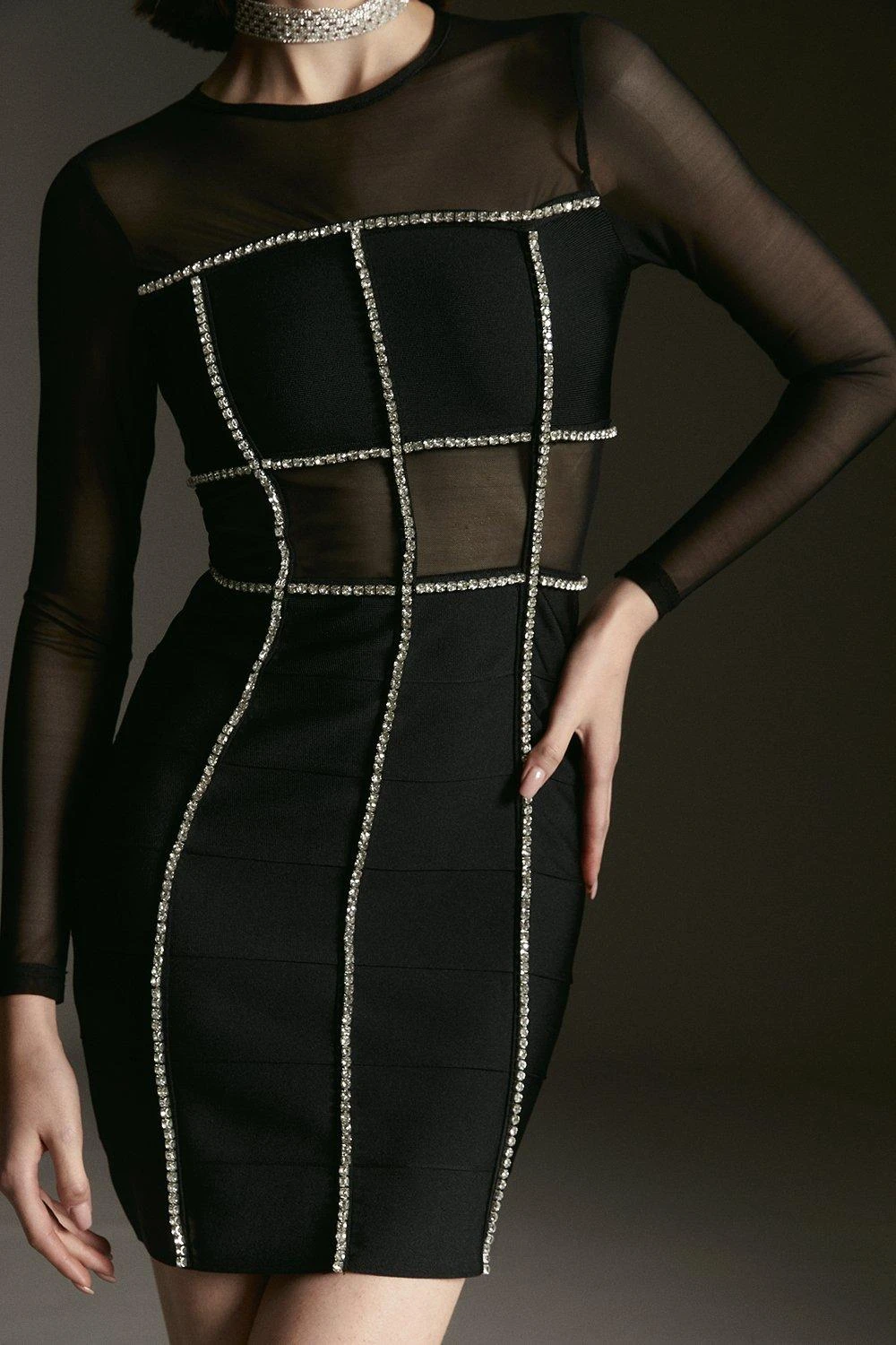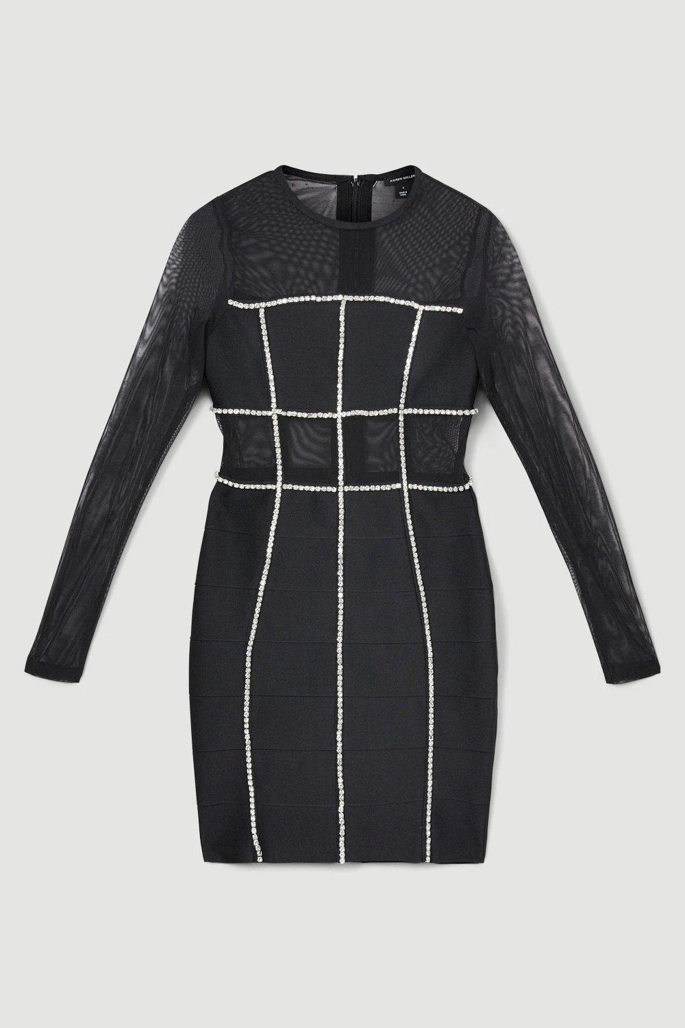 Encompass a premium party mood in this diamante trim mini dress. Crystal panelling combines with mesh fabric to create an ultra-glamorous effect, style this dress with diamante-detail heels and extravagant jewellery to complete the look.
