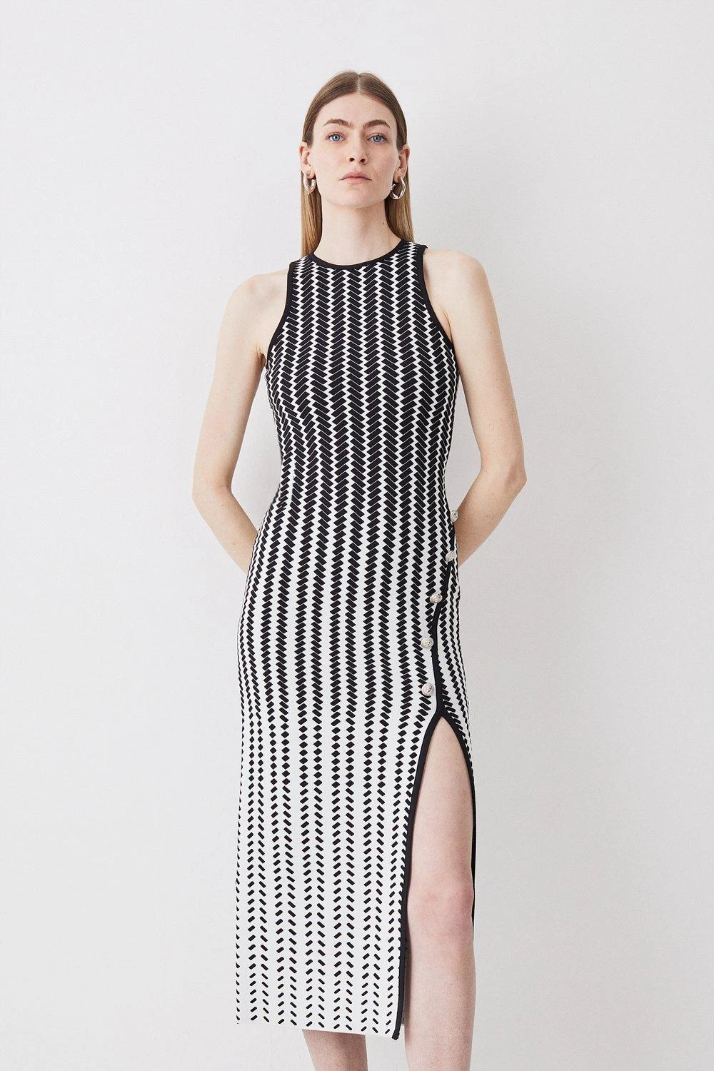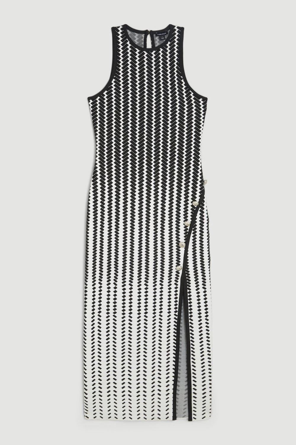 Crafted in an intricate geometrical pattern, this dress exudes contemporary appeal. An ombre design creates an optical illusion, while a lightweight knit fabric gently hugs the form. Embossed buttons add a premium finish.