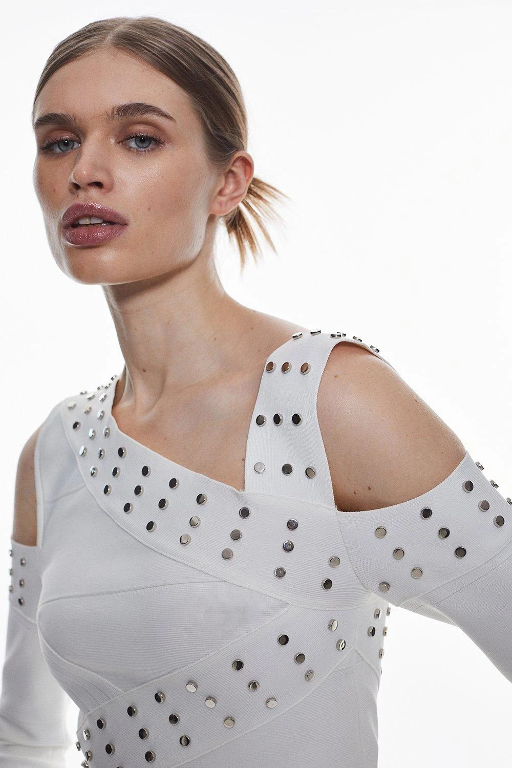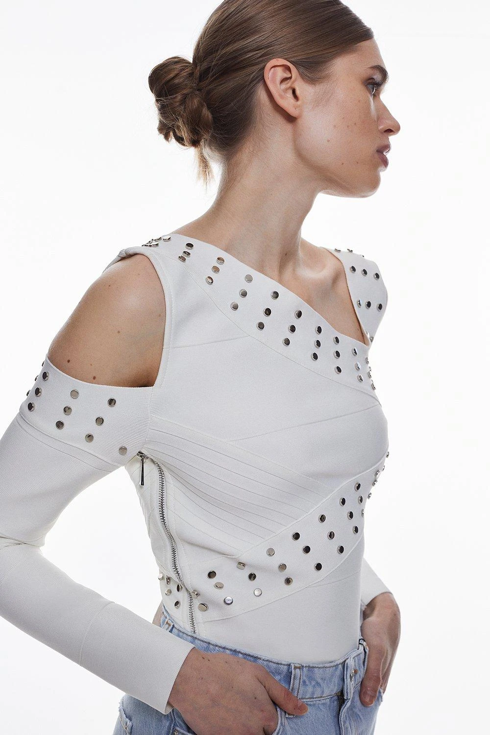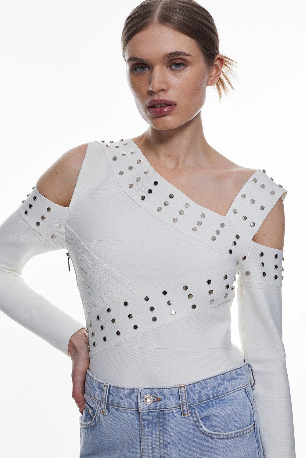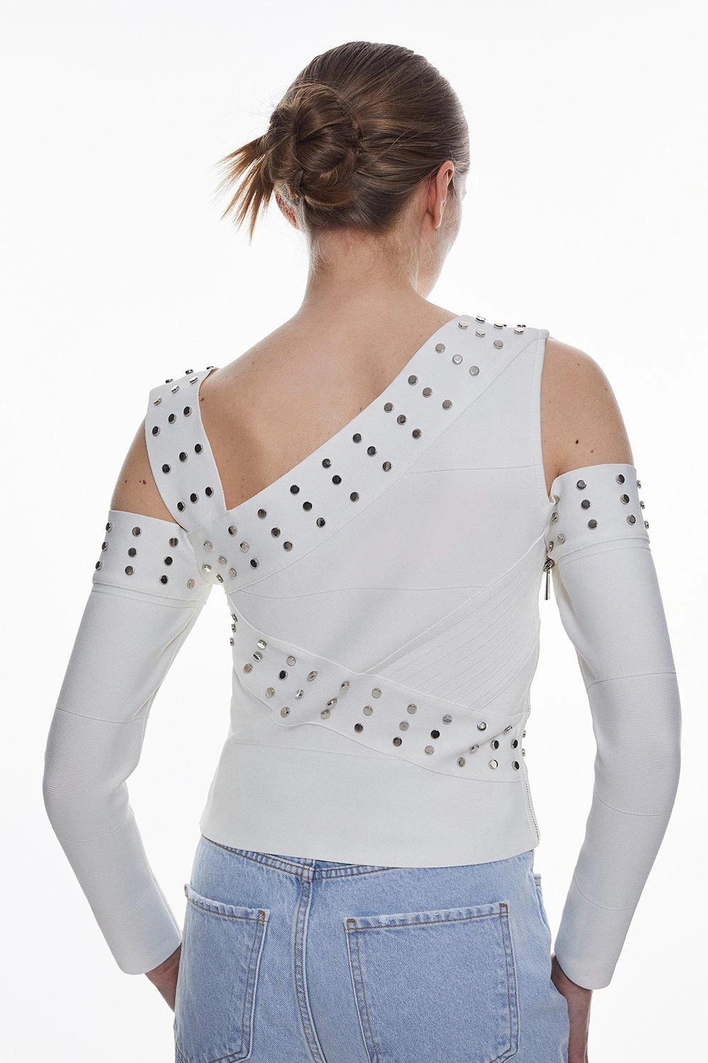Embrace a fashion-forward aesthetic in this asymmetric knit top. Metal stud details give this piece a considered edge, while asymmetric cut-out details this top a unique touch.