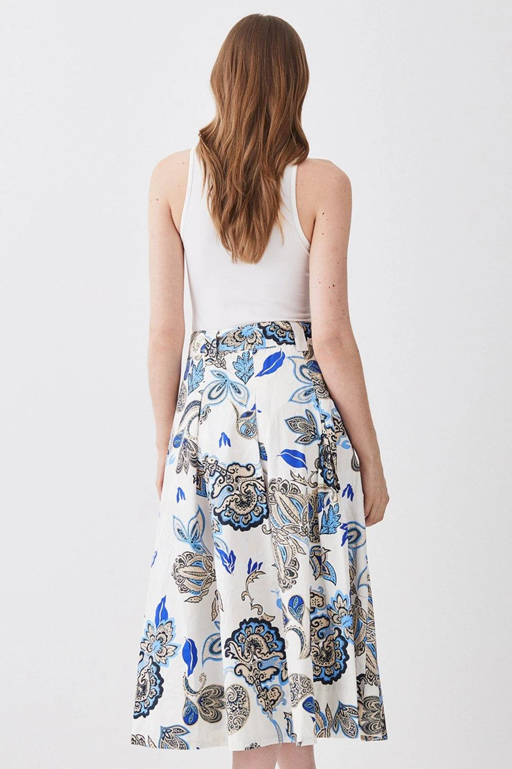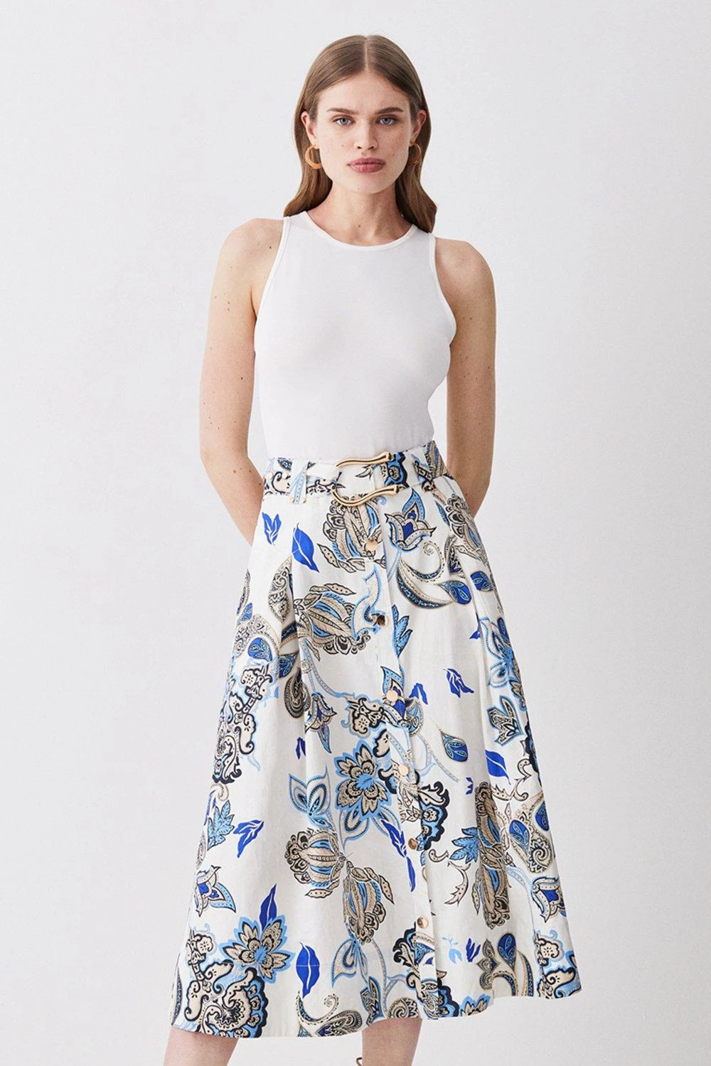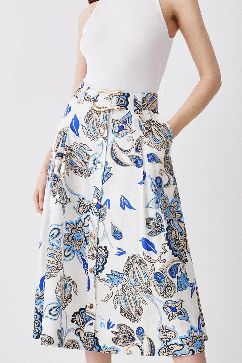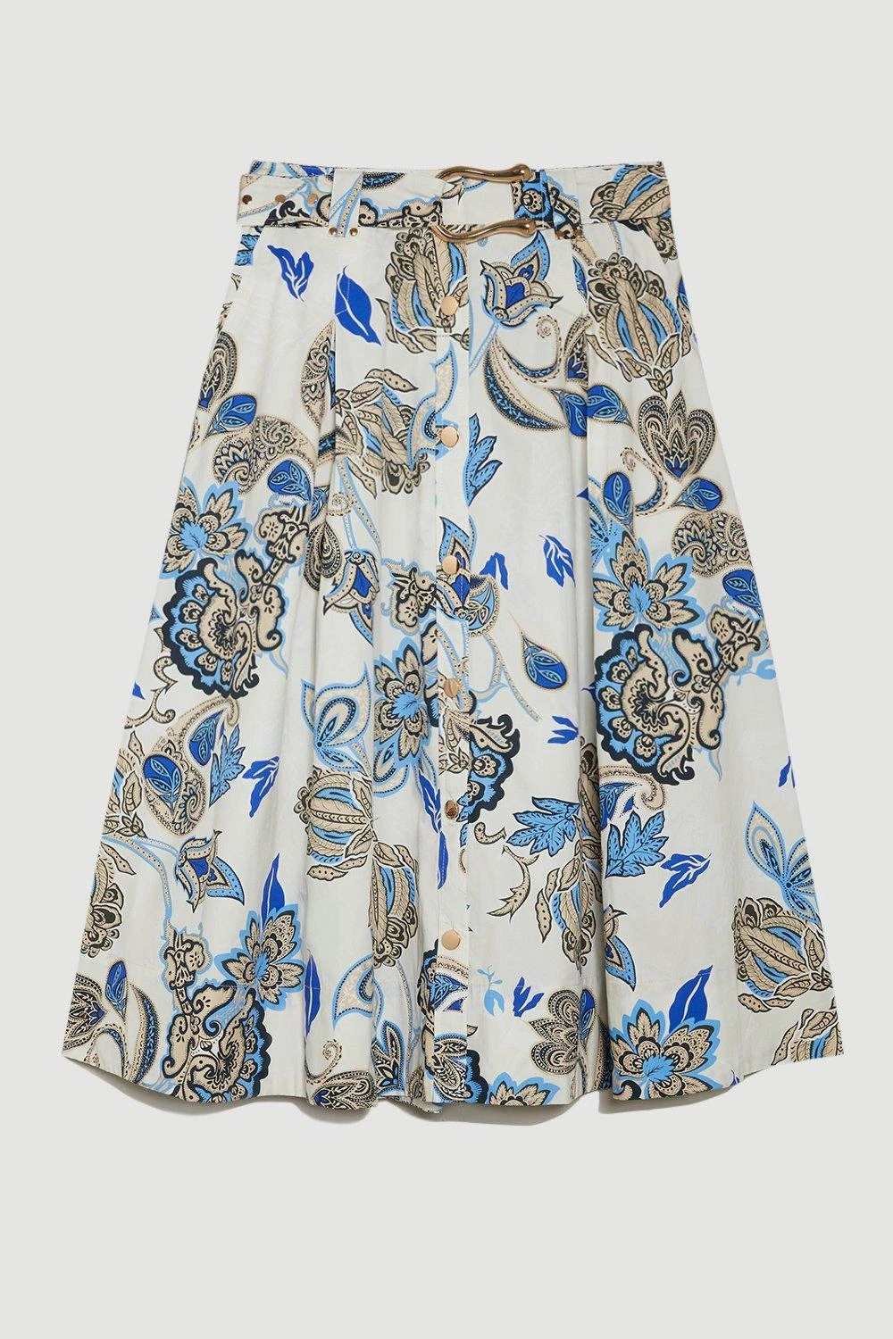 This elegant skirt features an intricate batik print and formal motifs, making it a natural choice for the spring season. Belted at the waist with a statement golden buckle, its full shape and high-rise waistline complement curves with ease. Crafted with cotton for a comfortable, lightweight fit, this skirt can easily be paired with a blouse and heels for garden parties, work days or weekend drinks.