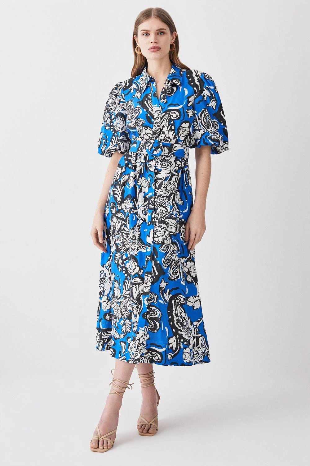 Karen Millen Batik Viscose Linen Belted Midi Shirt Dress