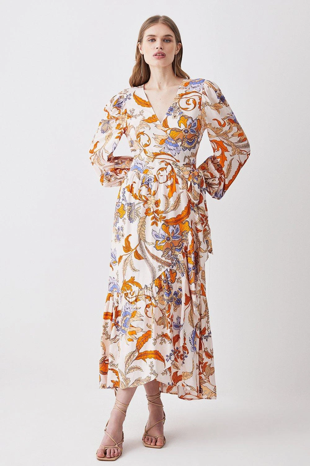 Woven with warm hues and a charming Batik print, this midi dress exudes summer optimism. A wrap front design naturally flatters the form, while a high-low hemline adds elegance.