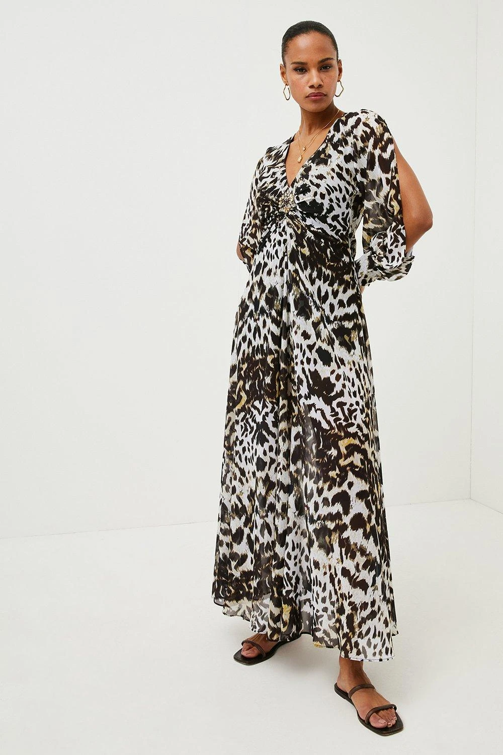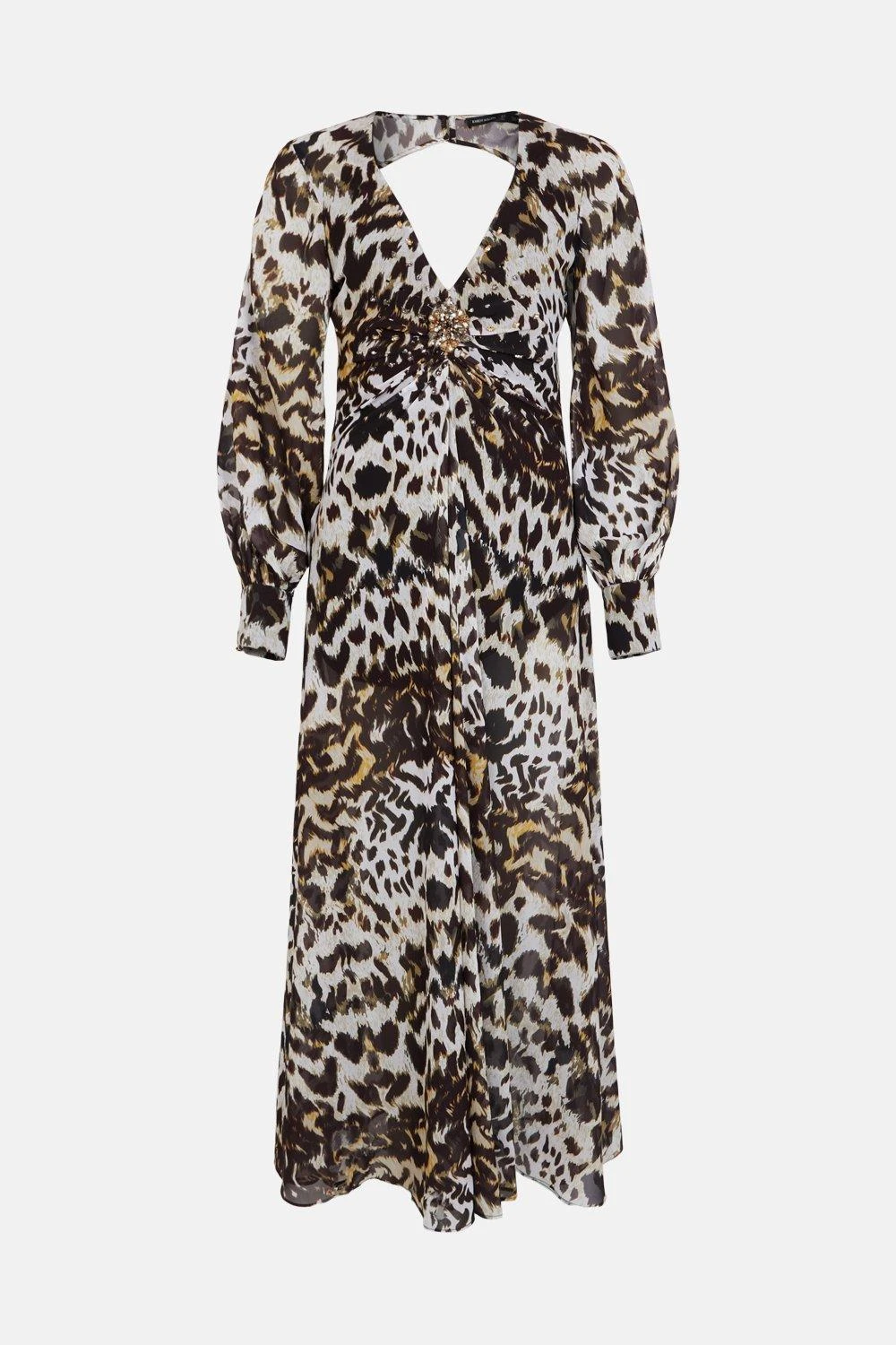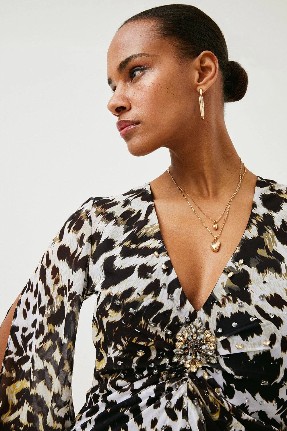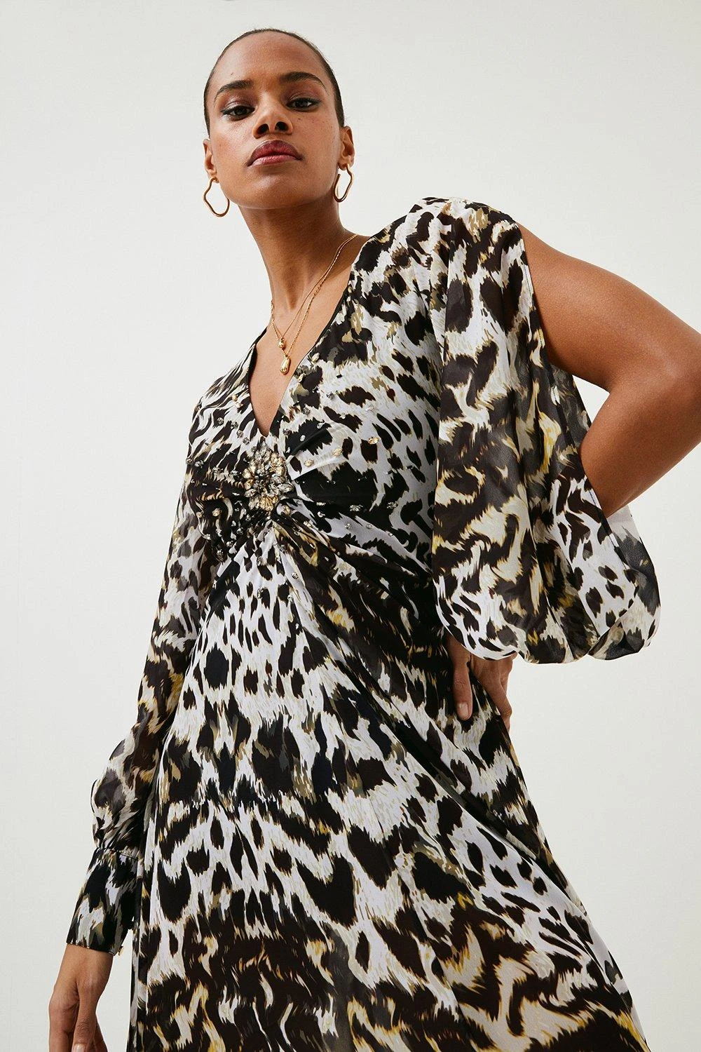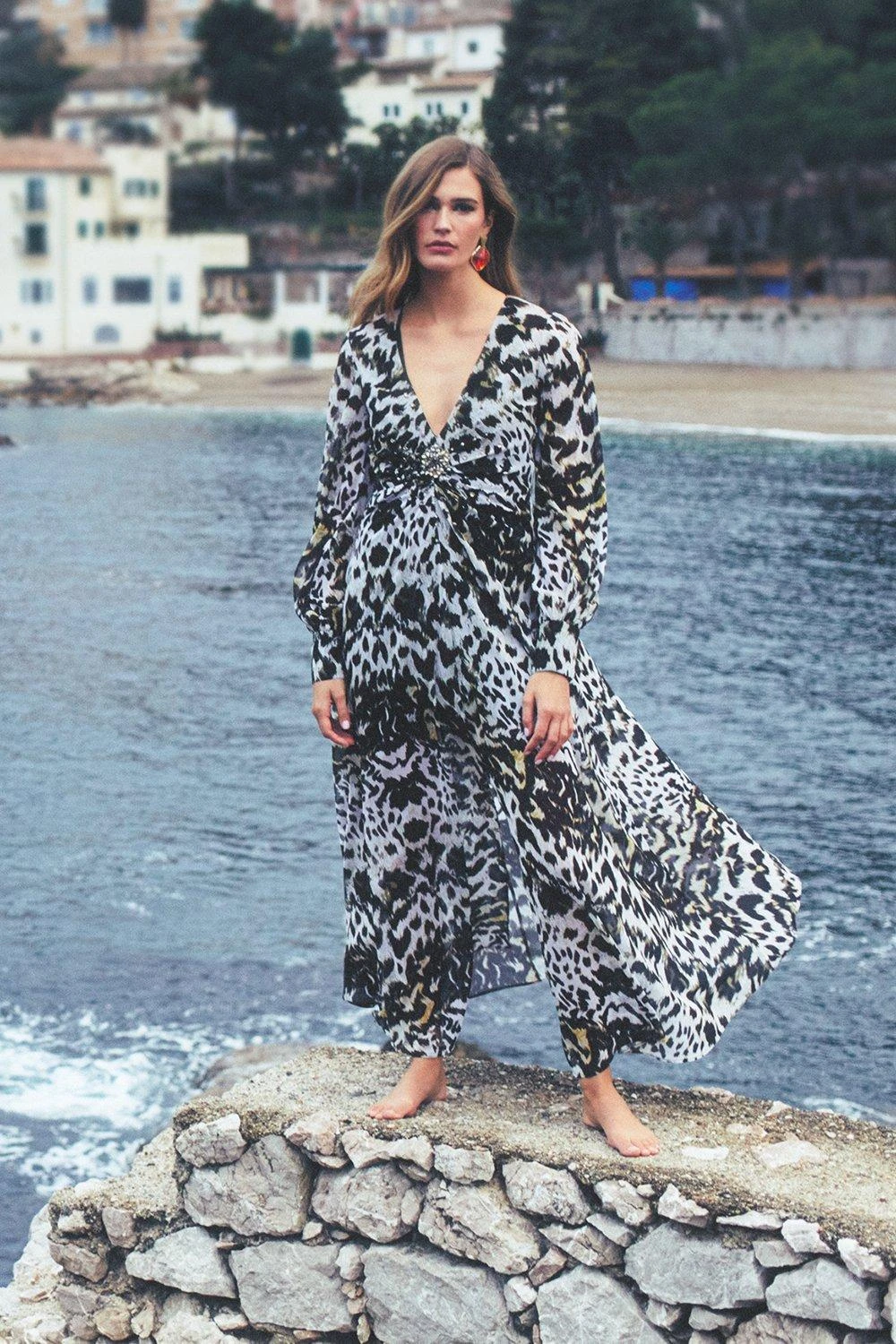 Bring a touch of decadence into your holiday wardrobe with this leopard jewel maxi dress. In a flowing dramatic design, it features a flattering deep V neckline, powerful voluminous sleeves and comes in an elegant leopard print. As a powerful flourish, it’s embellished with a sparkling jewel detail below the neck, making it a statement both in the daytime and evening.