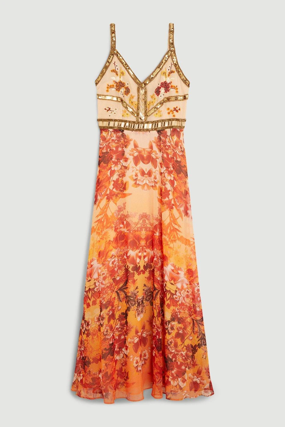Drenched in vibrant hues and floral motifs, this midi dress is perfectly suited to both summer soirees and autumnal weddings. Gold sequin embroidery across the bodice adds a touch of glamour, while a flowing skirt and floral print elevate this feminine piece.