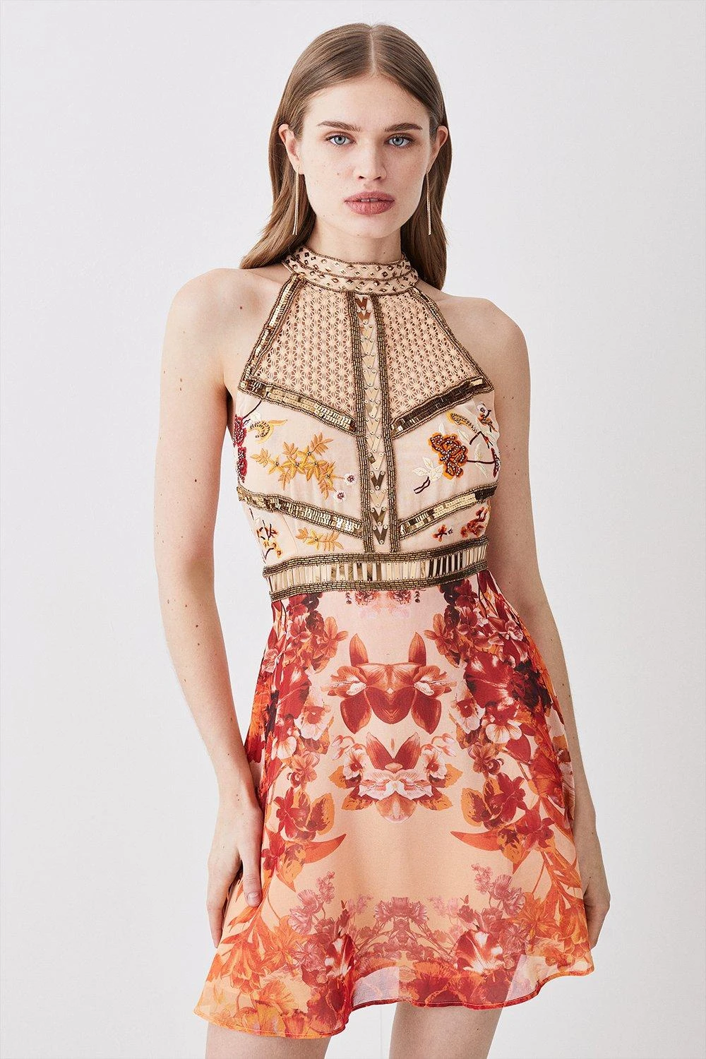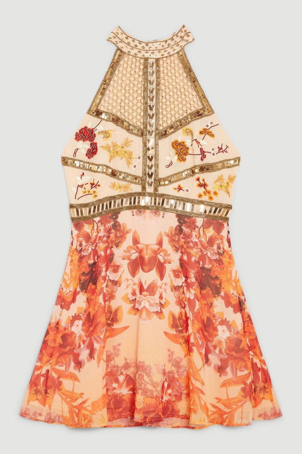 Drenched in vibrant hues reminiscent of summer optimism, this mini dress encapsulates warm weather elegance. A high halter neckline adds a level of sophistication, while gold sequin embroidery adds a touch of glamour. Strong floral motifs elevate this feminine piece.