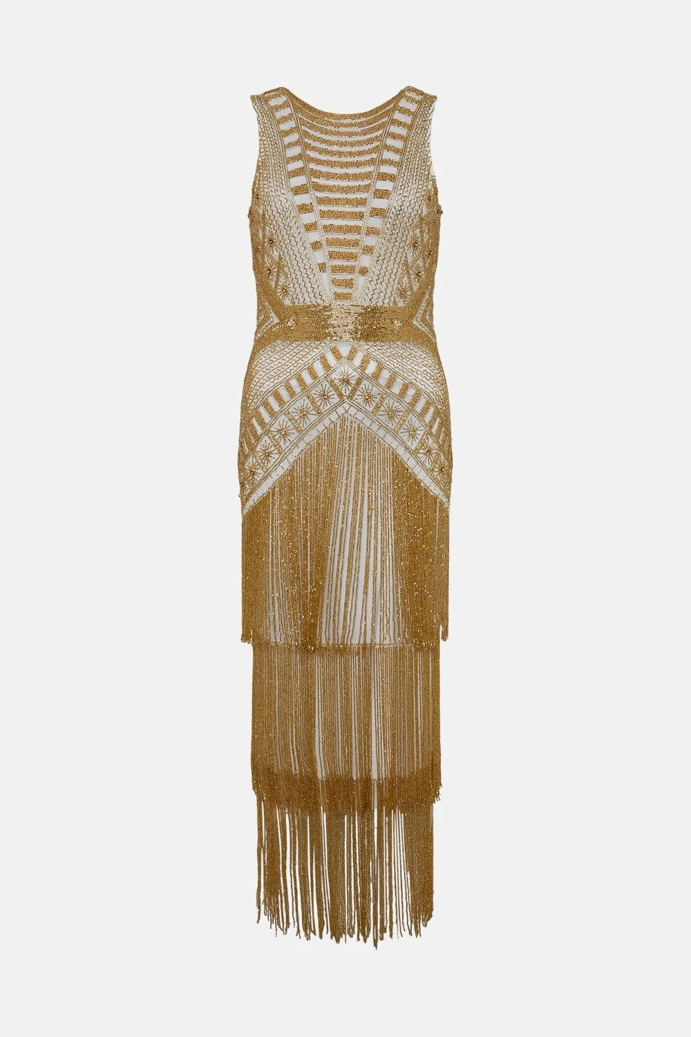 For a hit of Great Gatsby-inspired glamour take this dress for a spin. Detailed all over with intricate beads, it flows down to a dramatic tiered skirt bordered in swishy tassels. The sleek, sleeveless silhouette offsets a plunging V-back to bare polished shoulders beautifully, complementing a fringed hem that perfectly frames summer’s sparkling strappy heels.
