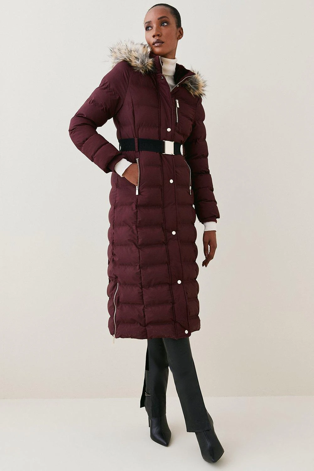 Outer: 24% Post-Consumer recycled Polyester, 72% Conventional Polyester. Lining: 100% Post-Consumer Recycled Polyester. Filling: 100% Polyester. Fur Trim: 55% Acrylic, 34% Modacrylic, 11% Polyester. Wash with similar colours. Turn inside out before cleaning. Model wears UK 8/US 4. Model height: 5″9. Length measurement: 114cm.