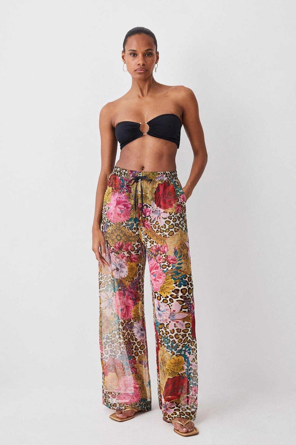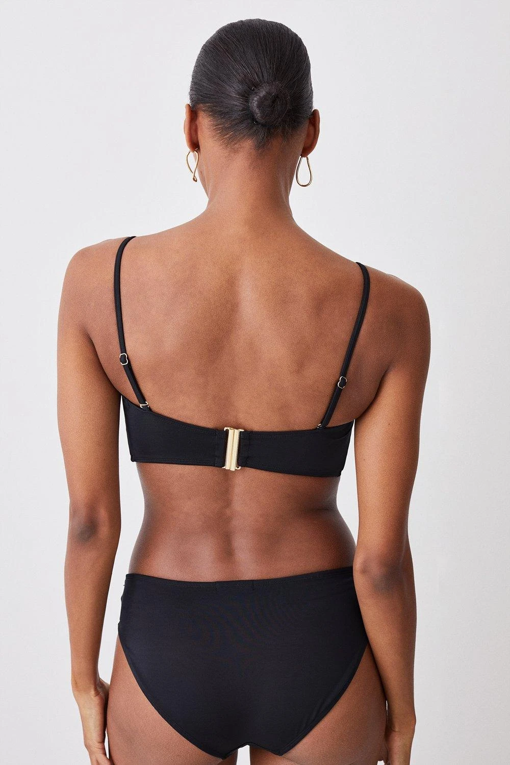 This sleek bikini top features a retro-inspired profile and adjustable straps for added support. A gold ring detail adds a glamorous finish.