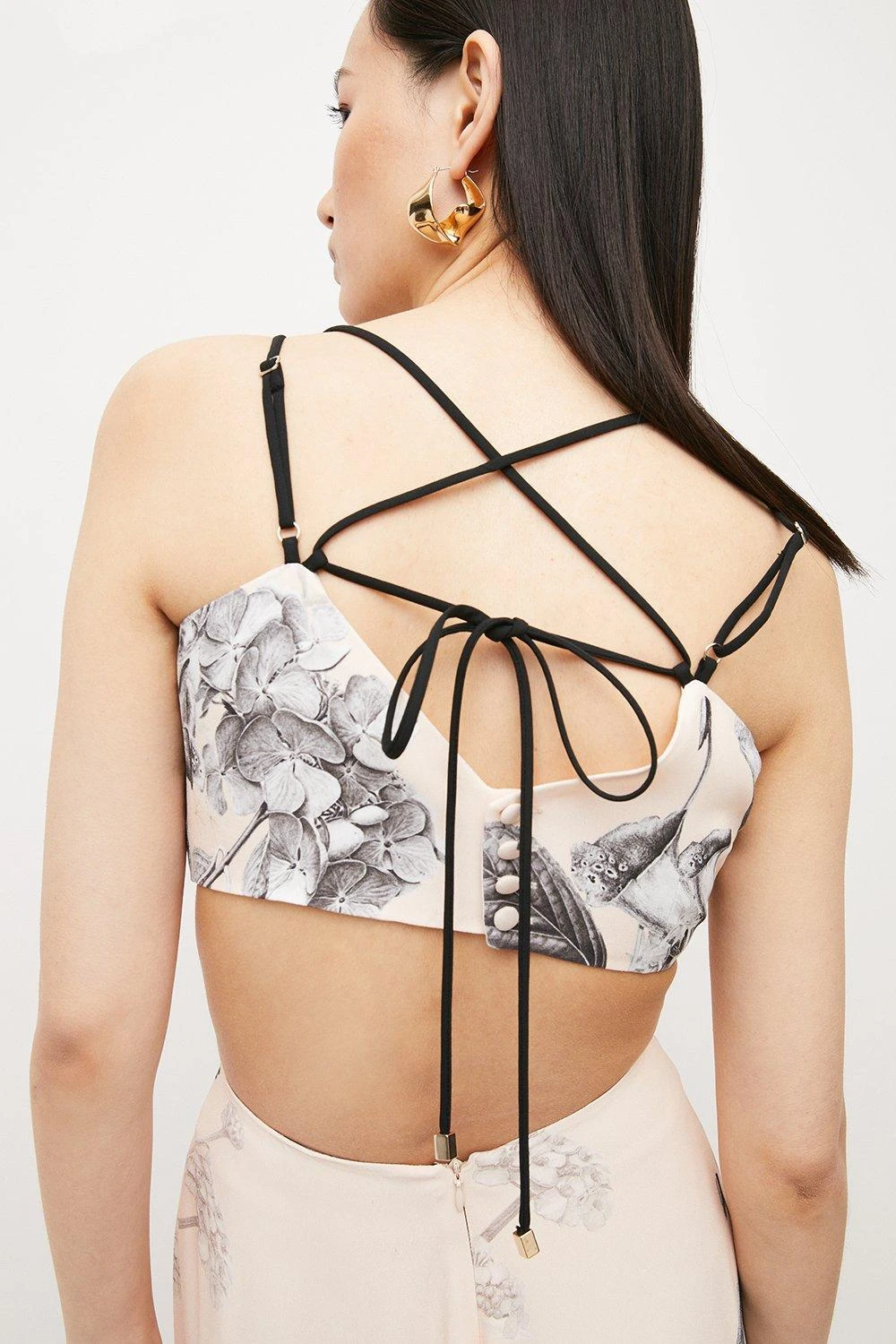 One for modern maximalists, this opulently printed maxi dress blooms with an exquisite hydrangea print. The romantic blush-pink tone feels just right for summer soirees, whilst black piped details add a hint of contemporary freshness. With its architectural cut-outs and crossover tie straps, this flowing design breathes new life into any after-dark repertoire.