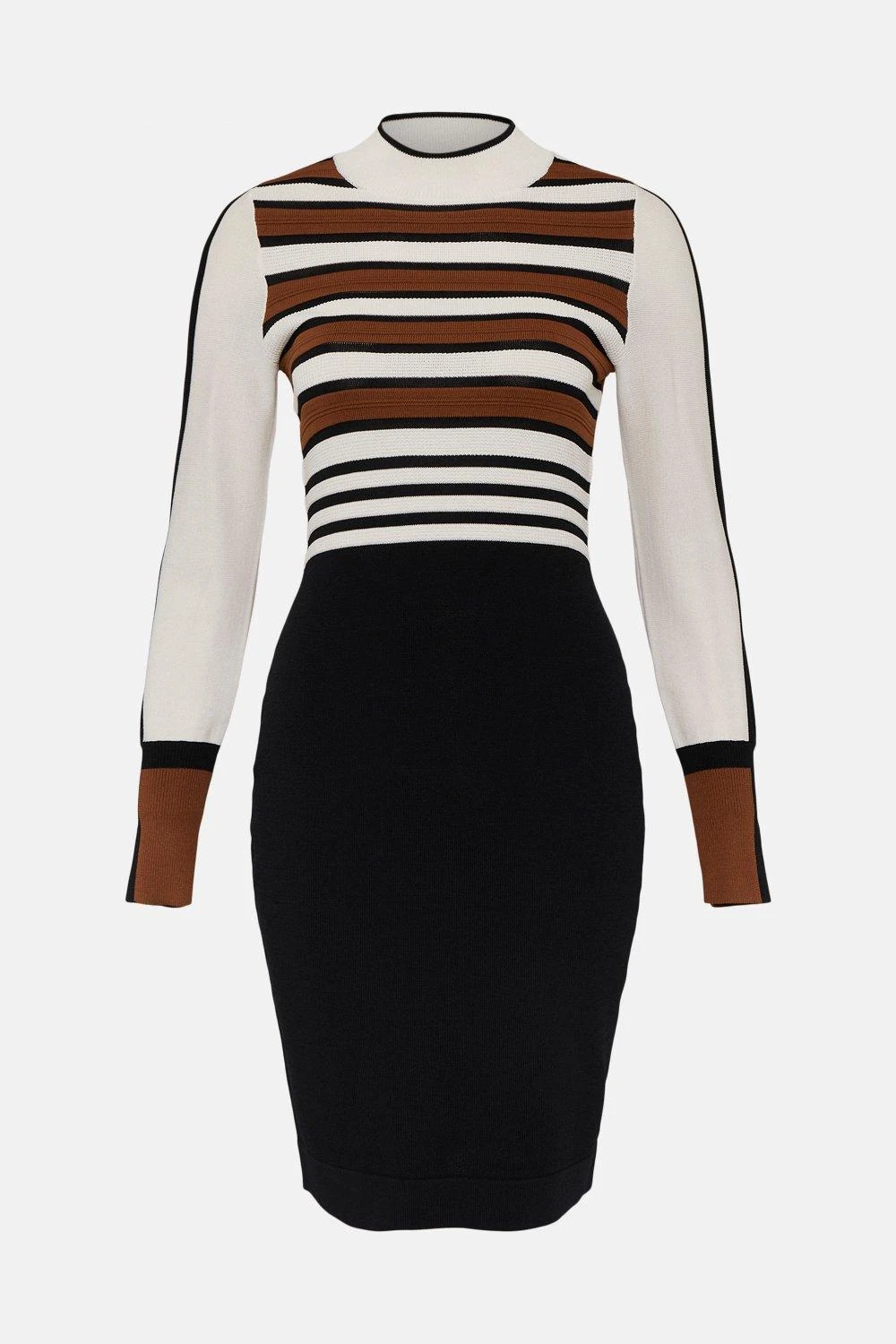 An instant style saviour, it’s made for the desk-to-dinner dash. This knitted dress features a figure-hugging bodycon fit, round neck, striped design, long fitted sleeves and comes in a mini length.