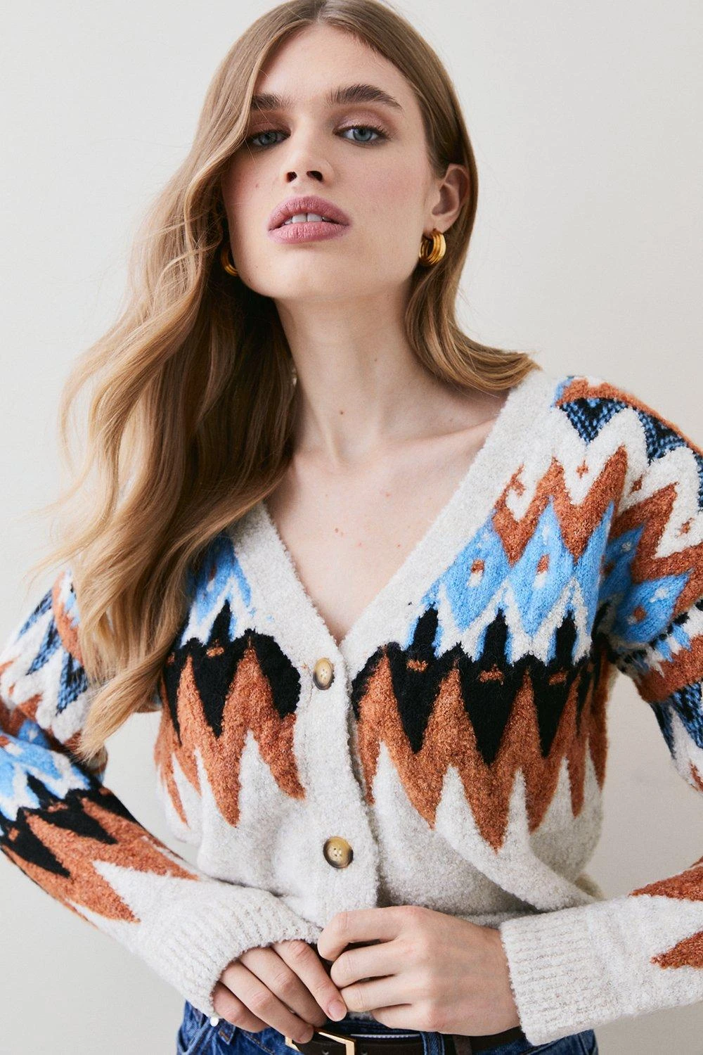 75% Acrylic 24% Polyester 1% Elastane. Wash as Synthetic. Model wears UK Small