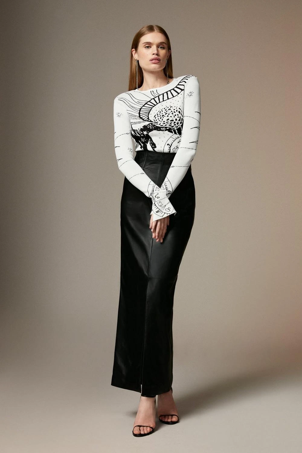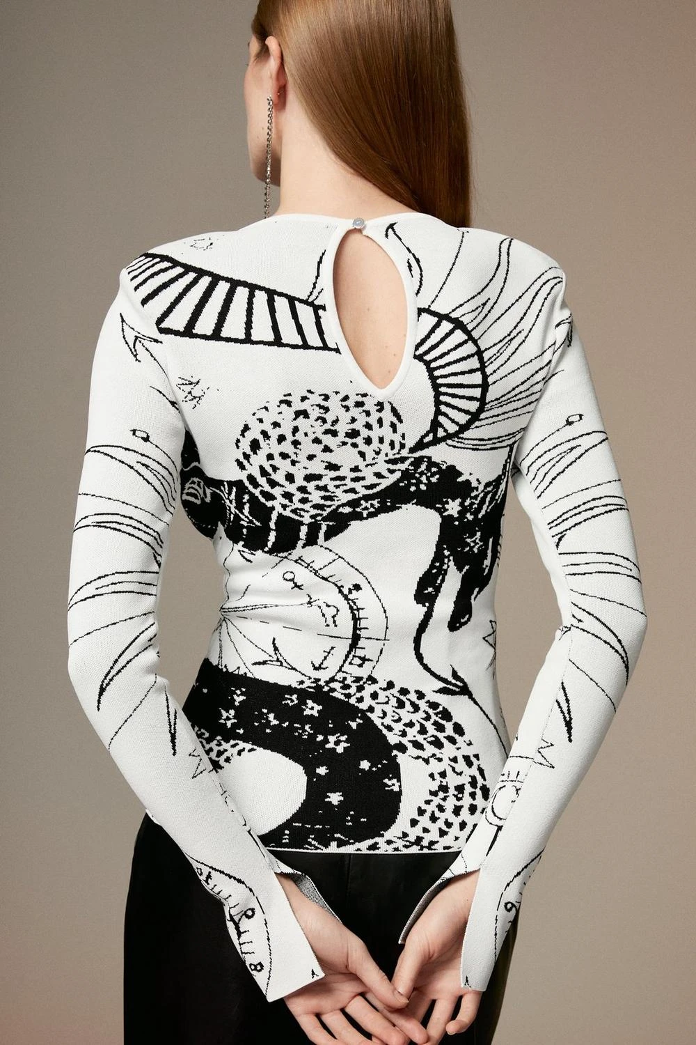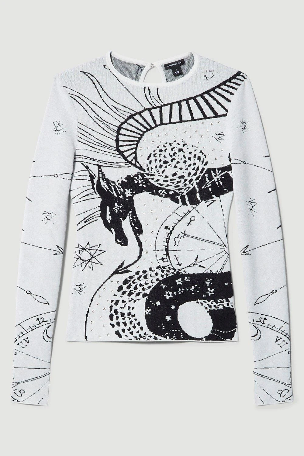 Taking inspiration from the realm of astrology, this long-sleeved top features zodiac symbols and mythical motifs. Crafted with a sumptuous knit blend, the top offers a comfortable fit and exudes high-level elegance. Style this piece with a leather maxi skirt for a sophisticated ensemble.