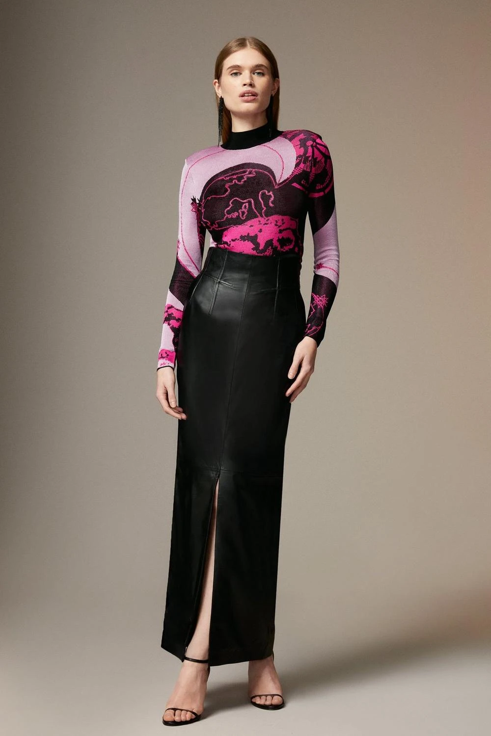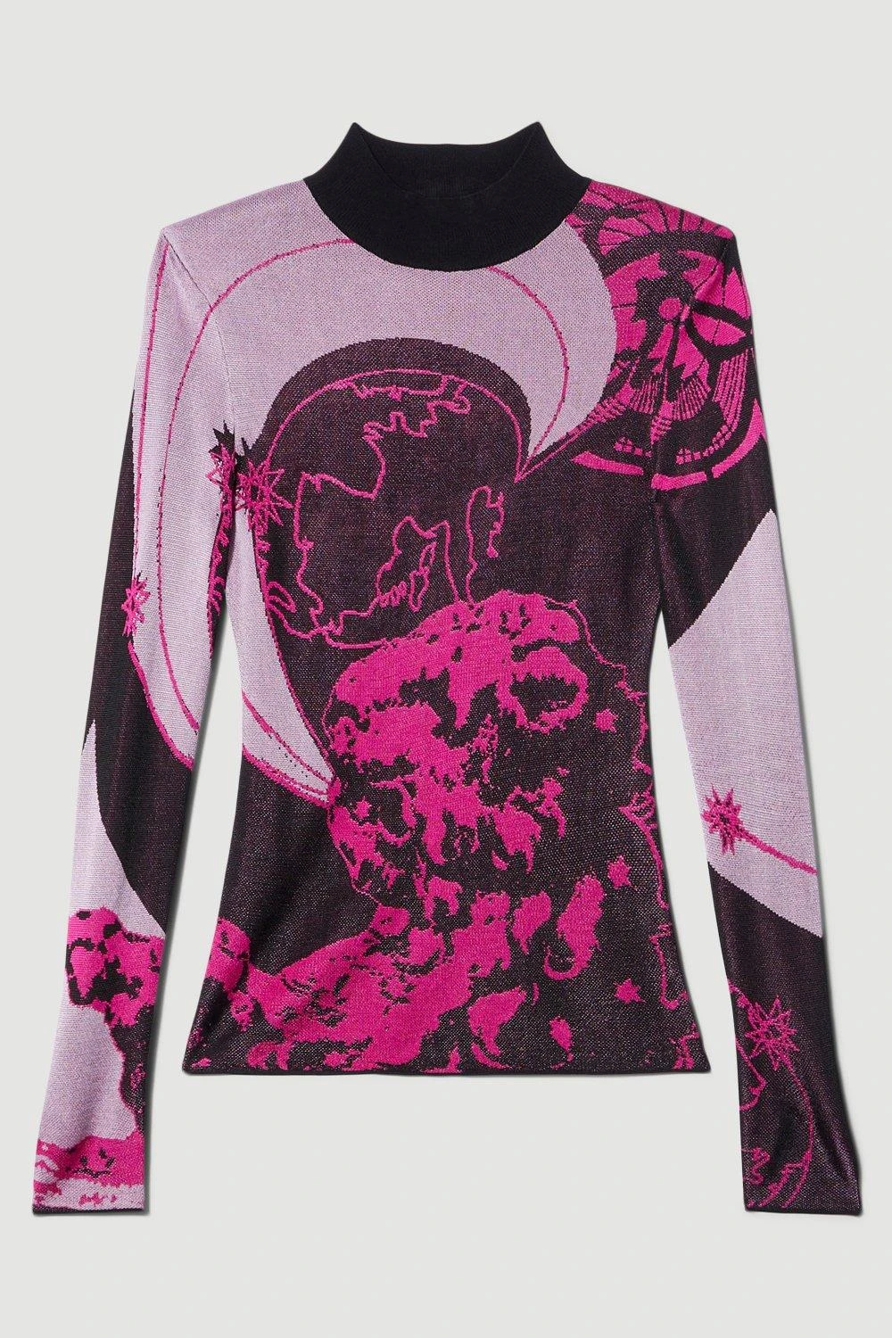 Showcasing an intricate pattern made up of clockwork motifs and navigation markings, this knitted top redefines elevated basics. Crafted with rich fuchsia hues and contrasting black tones, this top promises to make a powerful impact, style this piece with a leather maxi skirt for a sophisticated ensemble.