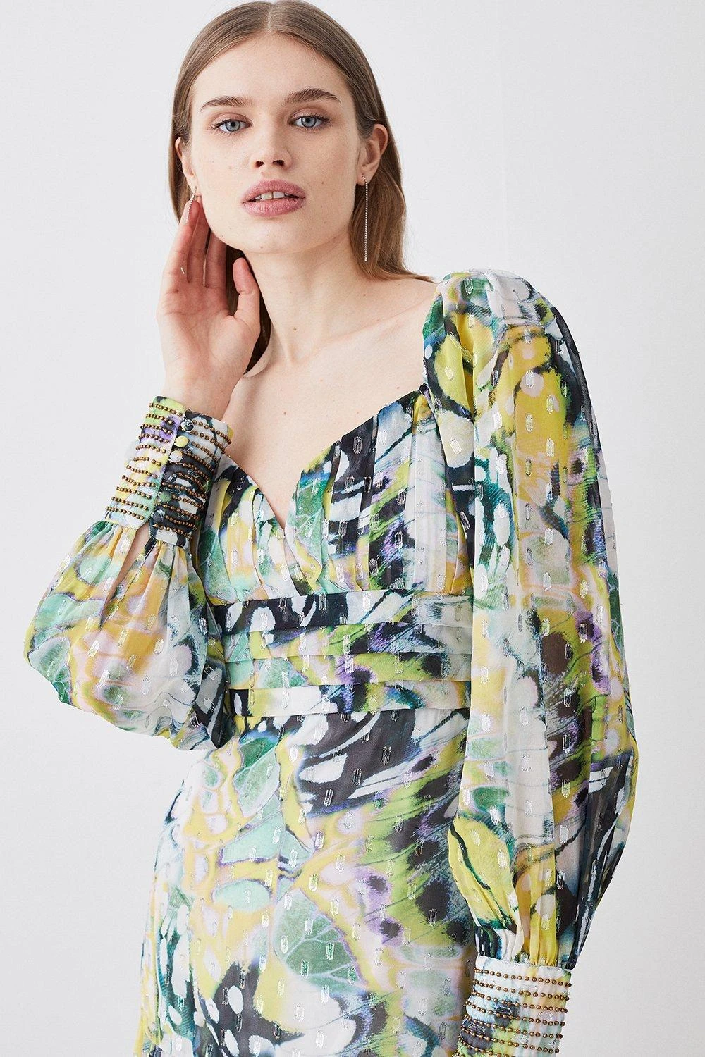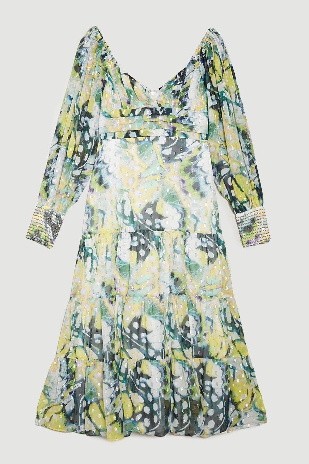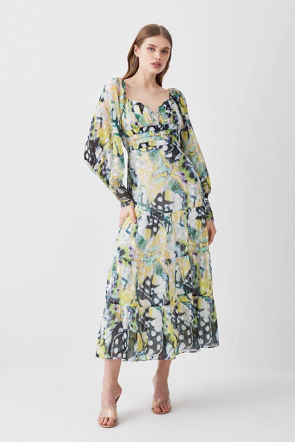 Crafted with iridescent metallic detailing and a butterfly print, this midi dress exudes romantic energy. Elegantly cascading down in floaty tiers of woven fabric, the dress creates a captivating effect. A sweetheart neckline and balloon sleeves add further character.