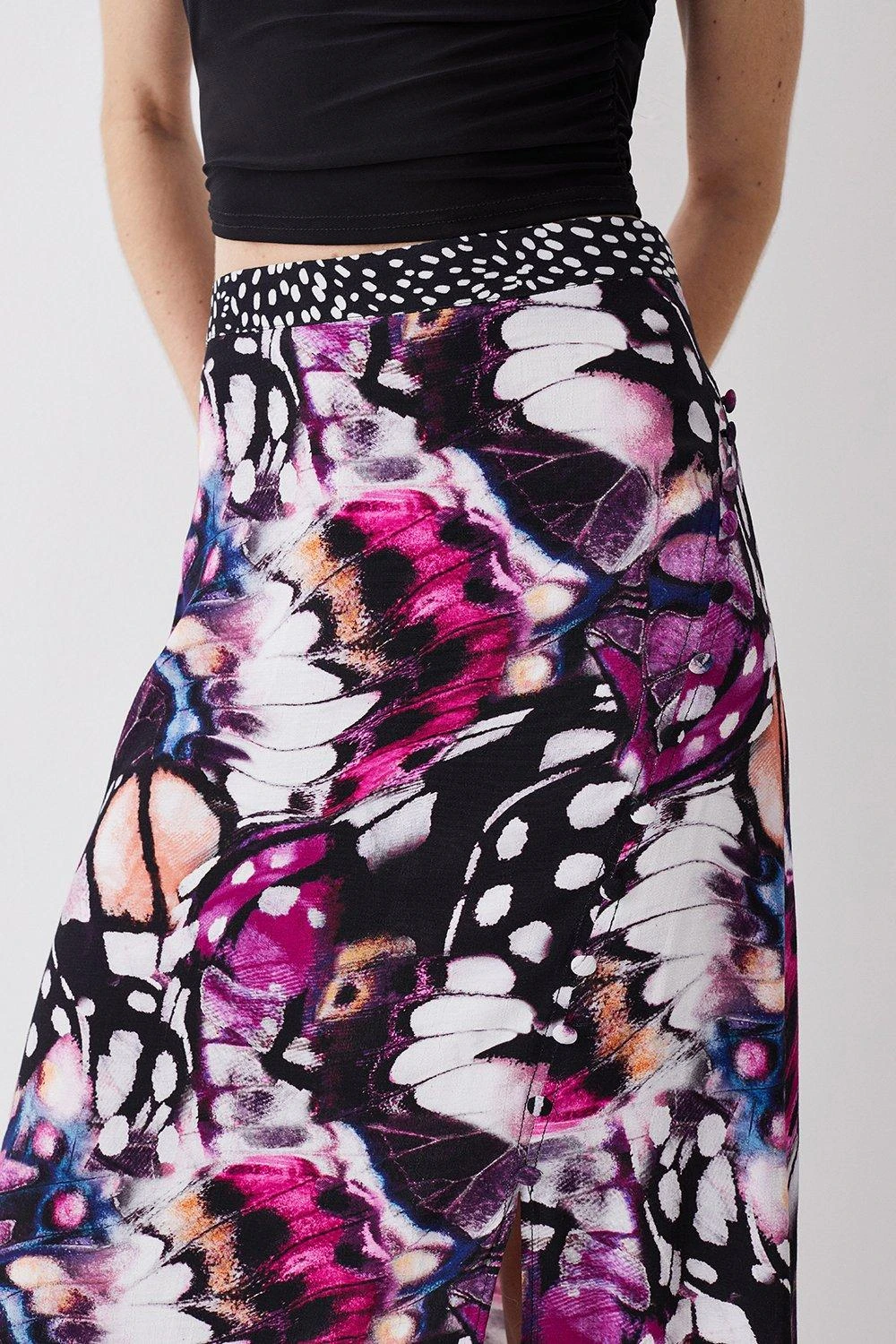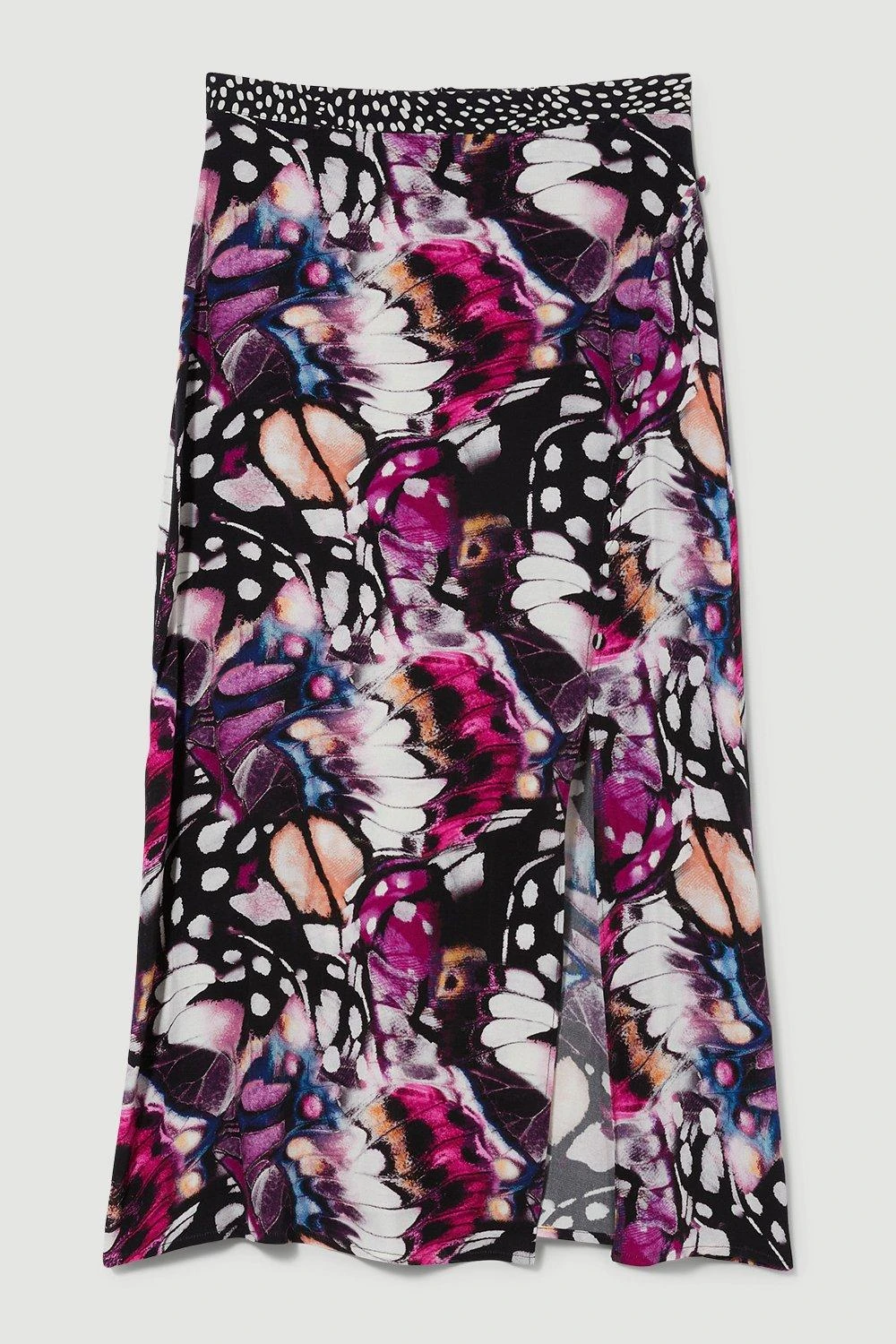 Doused in vivid purple shades and a butterfly print, this midi skirt makes a truly unique addition to your wardrobe. A leg slit adds a playful touch to this feminine silhouette. Style this skirt with a crop top for summer months or a rollneck jumper for colder seasons.
