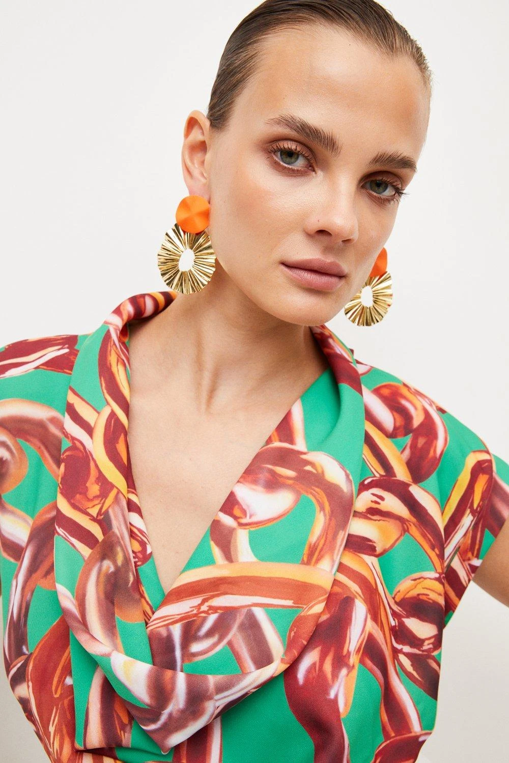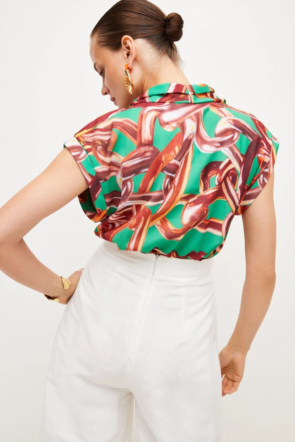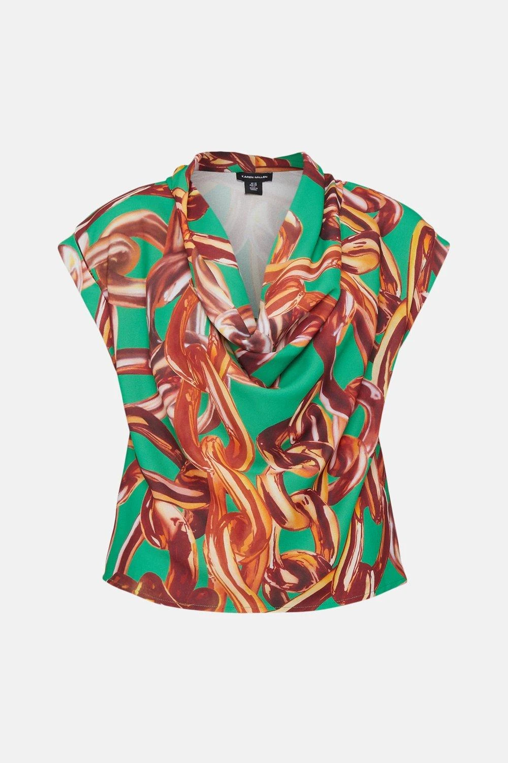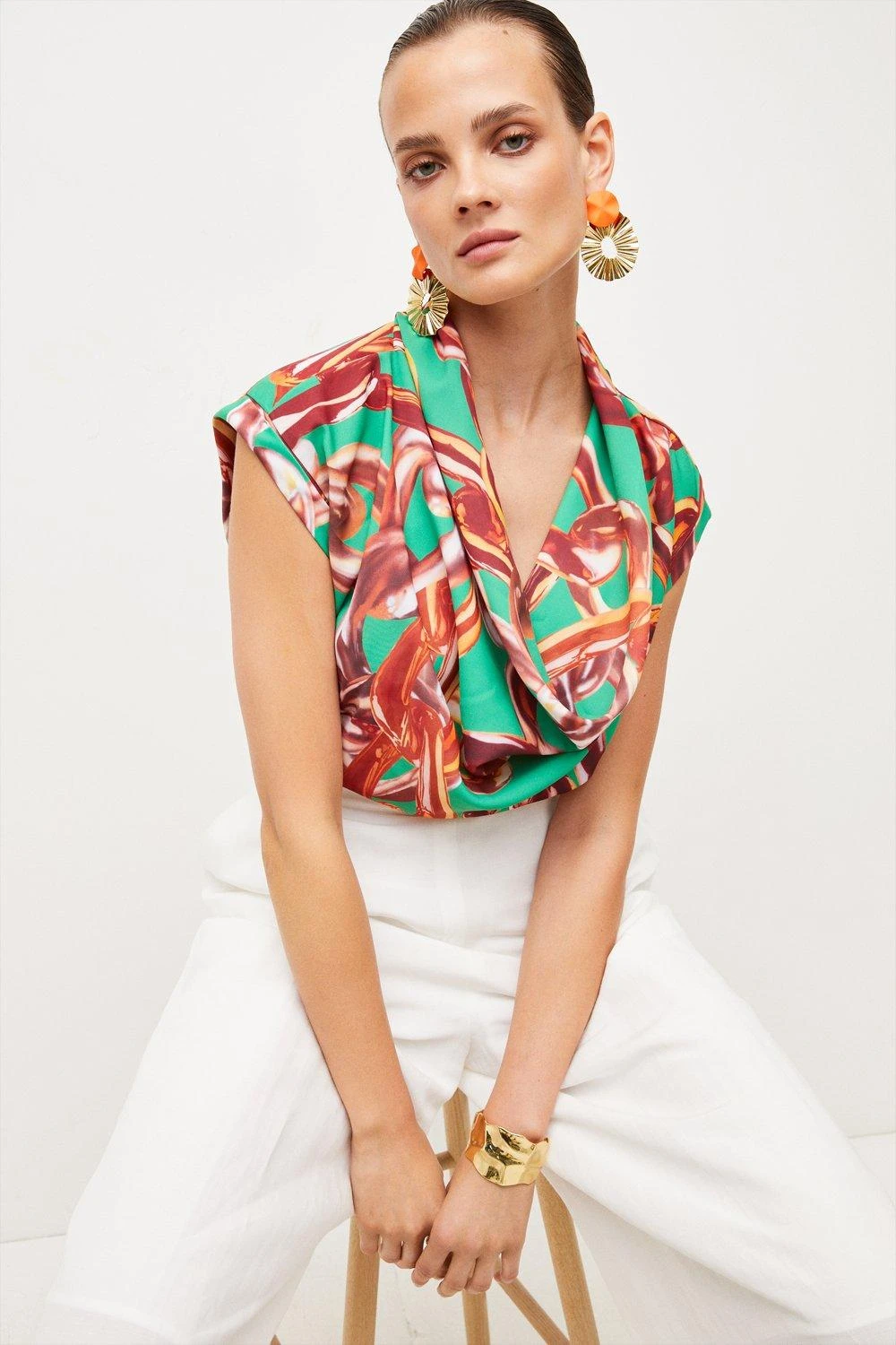 Reframing the high-glamour drama of the nineties with contemporary direction, meet your new favourite statement piece. Masterfully draping the frame with the soft folds of a cowl neckline, this woven top is realised with a graphic chain print. Complete with capped short sleeves, stride into a season of warm-weather styling with bold red lips and white denim.