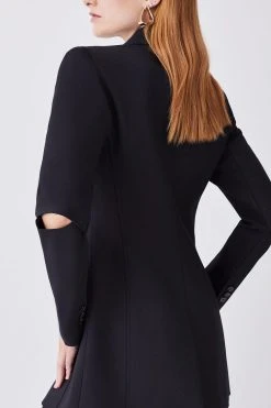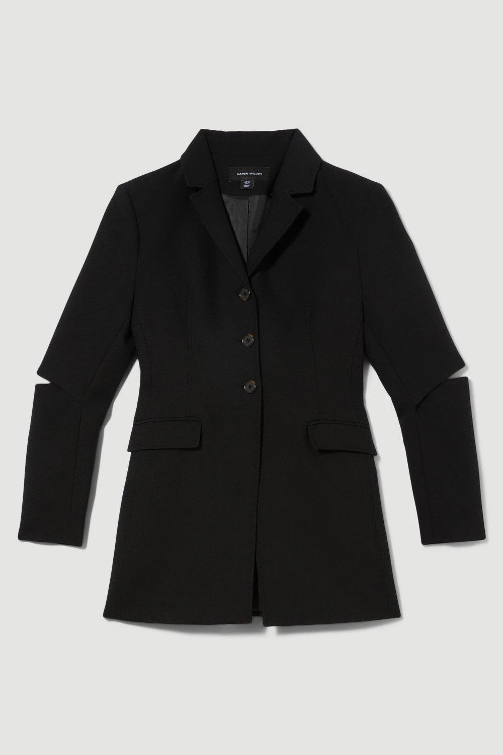 Take a contemporary approach to formal dressing with this clean tailored blazer. This piece features cutout details at the elbow, offering a fashion-forward aesthetic. Single-breasted buttons, flap pockets and notched lapels offer a polished finish. Style this piece with slim-leg trousers for a sleek ensemble.