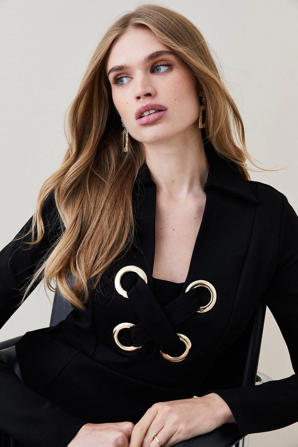 Big impact, minimal effort. This show-stopping jersey top features oversized eyelets and lace-up detailing framing the front, offsetting a pointed collar for that inimitable 1970s feel. Highlight the plunging neckline with a gleaming silver necklace to match the elegant eyelets.