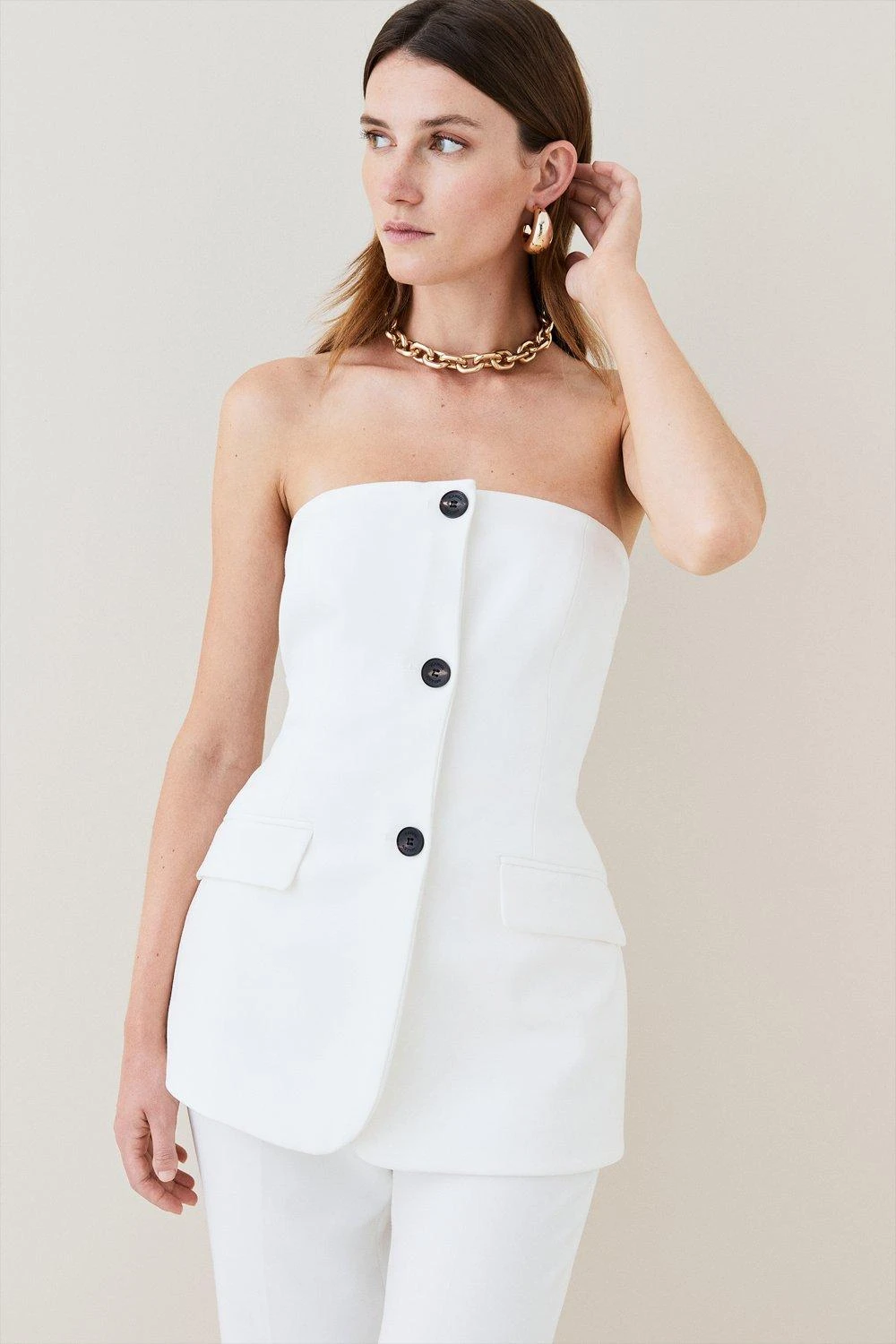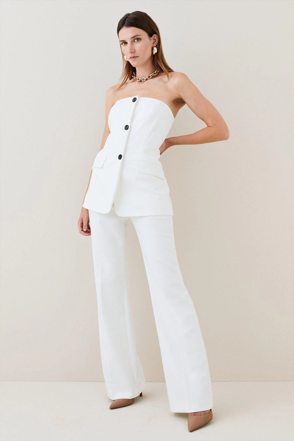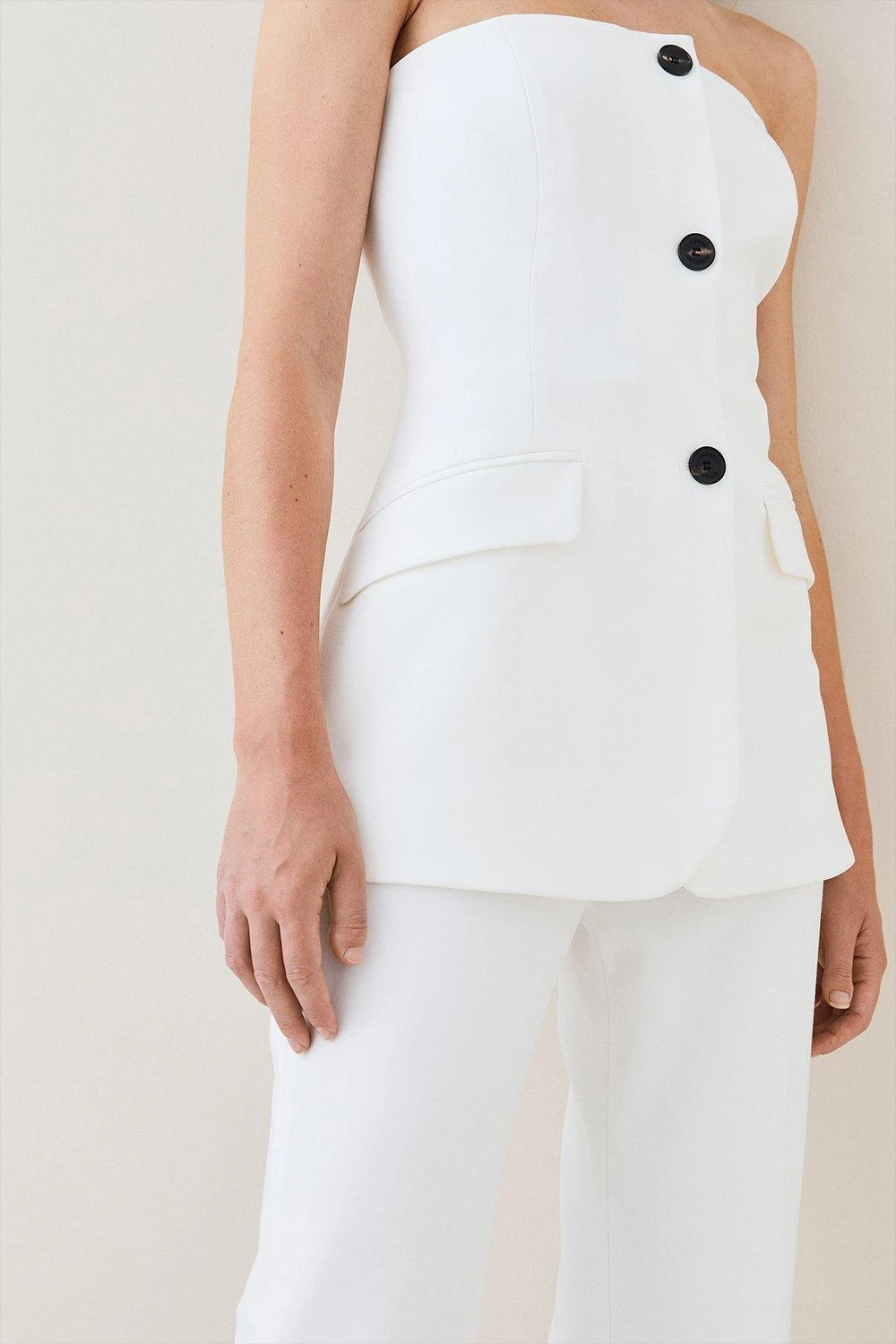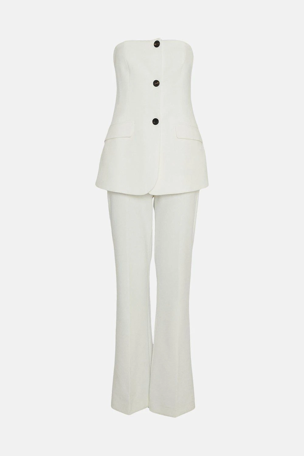 Combine a sleek aesthetic with an urban mood in this compact stretch jumpsuit. A strapless bandeau bodice paired with flared trousers accentuates the silhouette by creating the appearance of a softly cinched waist. Polished black buttons and jetted pockets add contemporary features. Style with pointed heels and statement jewellery to complete the look.