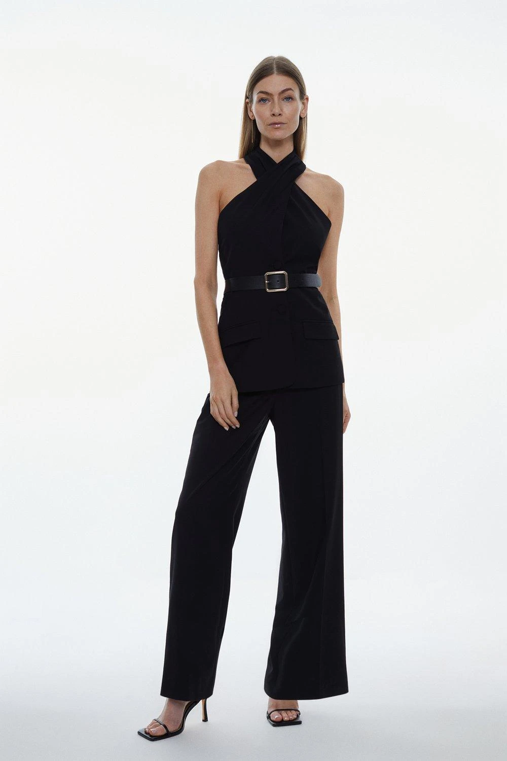 An elegant choice for both special occasions and everyday wear, this one-piece is crafted from signature Compact Stretch fabric and features a feminine crossover halter neckline, wide leg cut and belted waist.