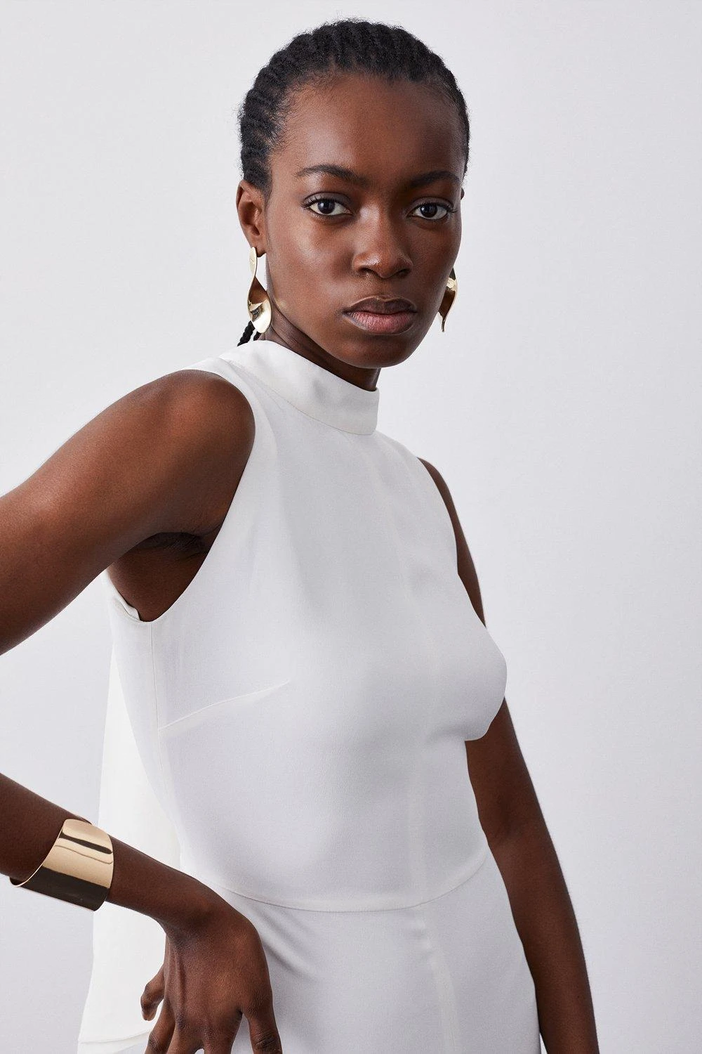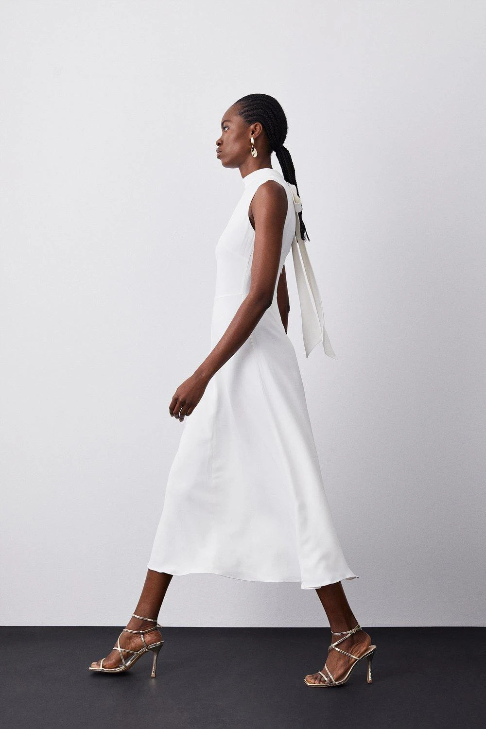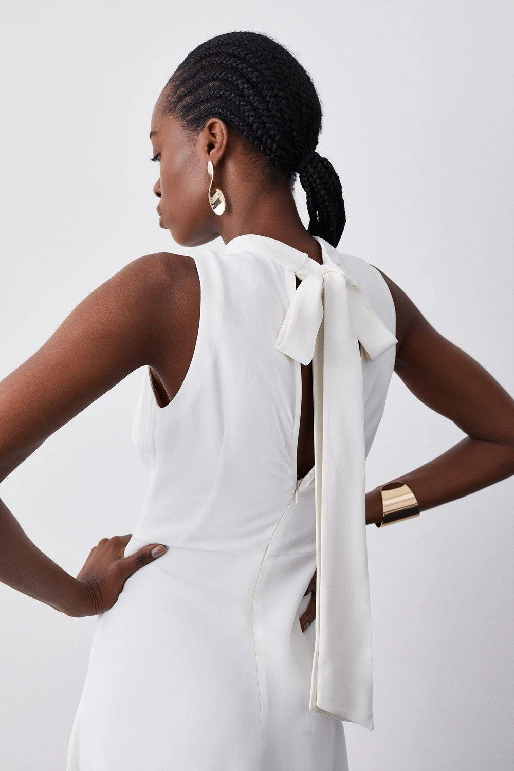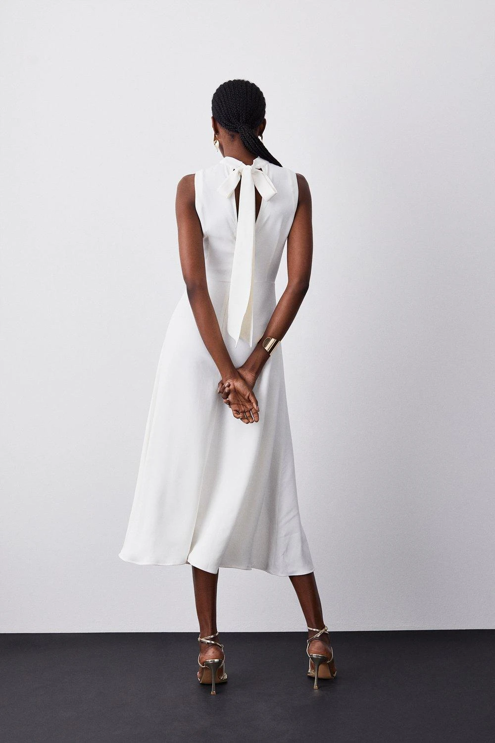 This sleek and refined midi dress has been elevated with a back bow detail, adding a unique touch. Signature compact stretch material effortlessly flows over the silhouette, creating a flattering fit. Style this piece with strappy heels for an elegant occasion ensemble.