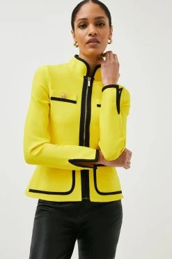 Bold colours are big news for the new season, as proven by this beautifully vivid bandage jacket. Detailed with contrast piping and buttoned pockets, it lends graphic allure to black trousers and fastens securely with a sporty front zip.