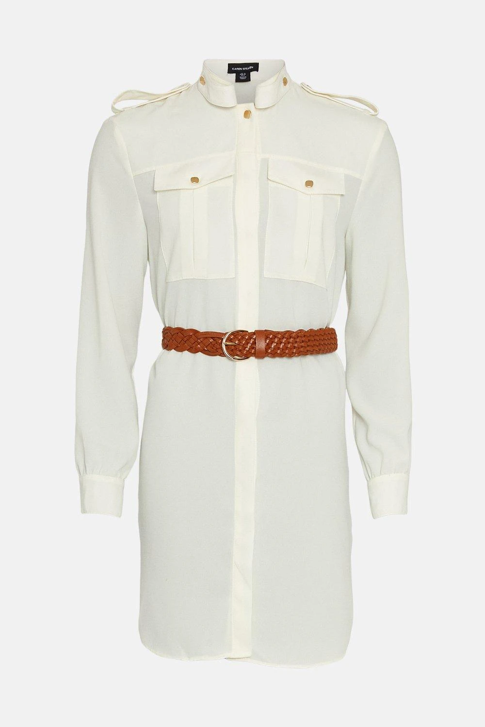 A refined example of modern utility, this belted crepe shirt dress ticks every box for work-to-weekend styling. It features understated design details – patch pockets, concealed button closures and shoulder epaulettes – pulled together with a braided leather belt for a final dash of polish.