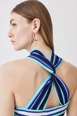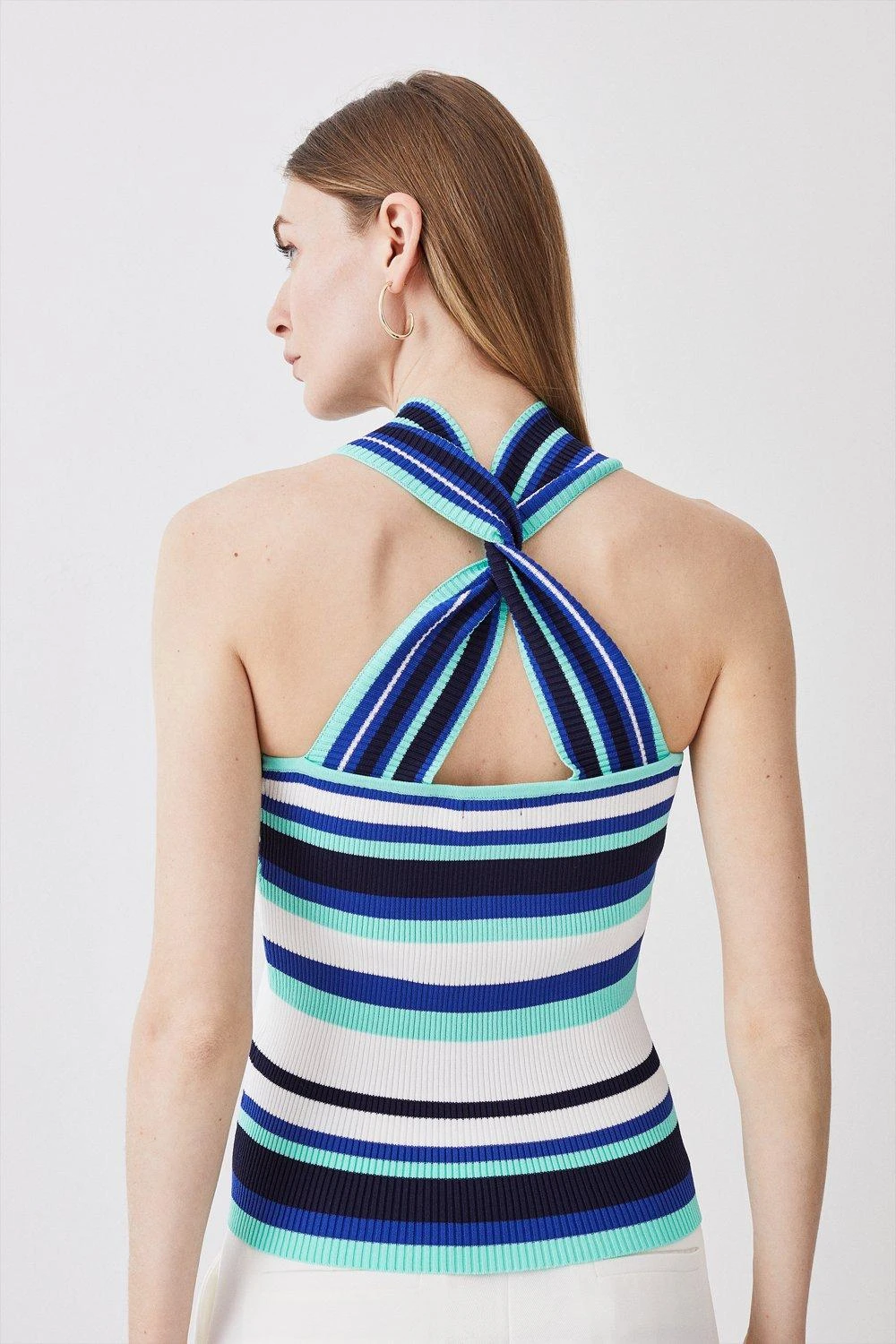 Combining nautical stripes with a vibrant colour-block pattern, this knitted top makes a unique addition to your everyday rotation. A contemporary crossover neckline adds a dynamic element to this piece, while ribbed knit material naturally hugs the form.