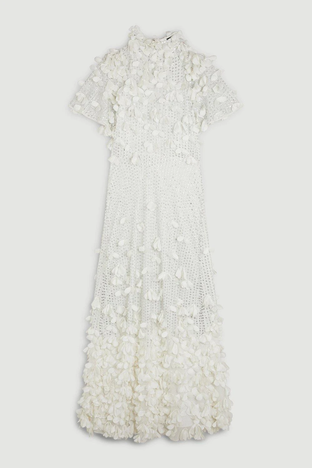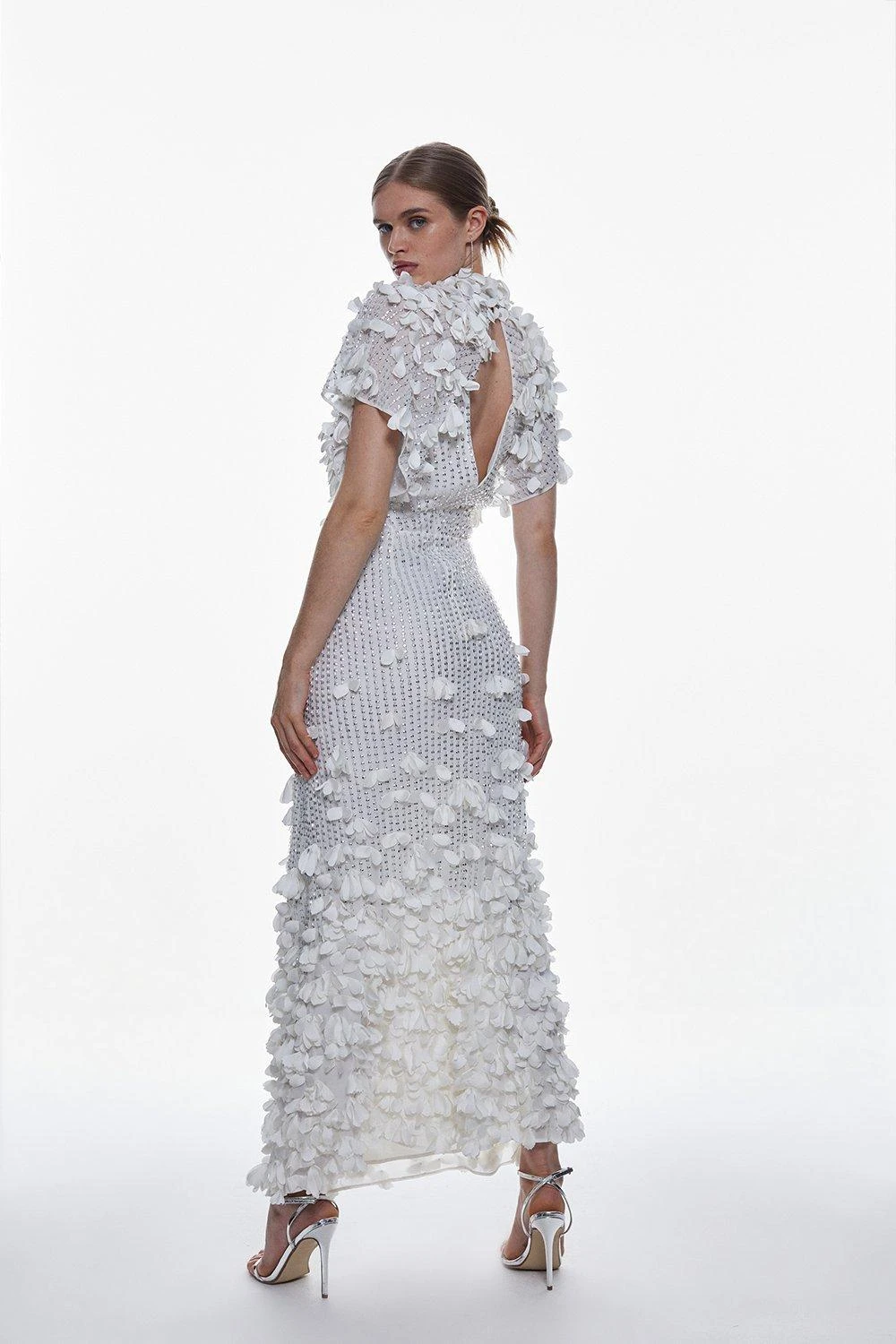 The ultimate feminine show-stopper, this maxi dress combines petal-like applique details with all-over crystal embellishments. Defined by ethereal angel wings, this dress exudes undeniable elegance and glamour. Complete the look with metallic heels.