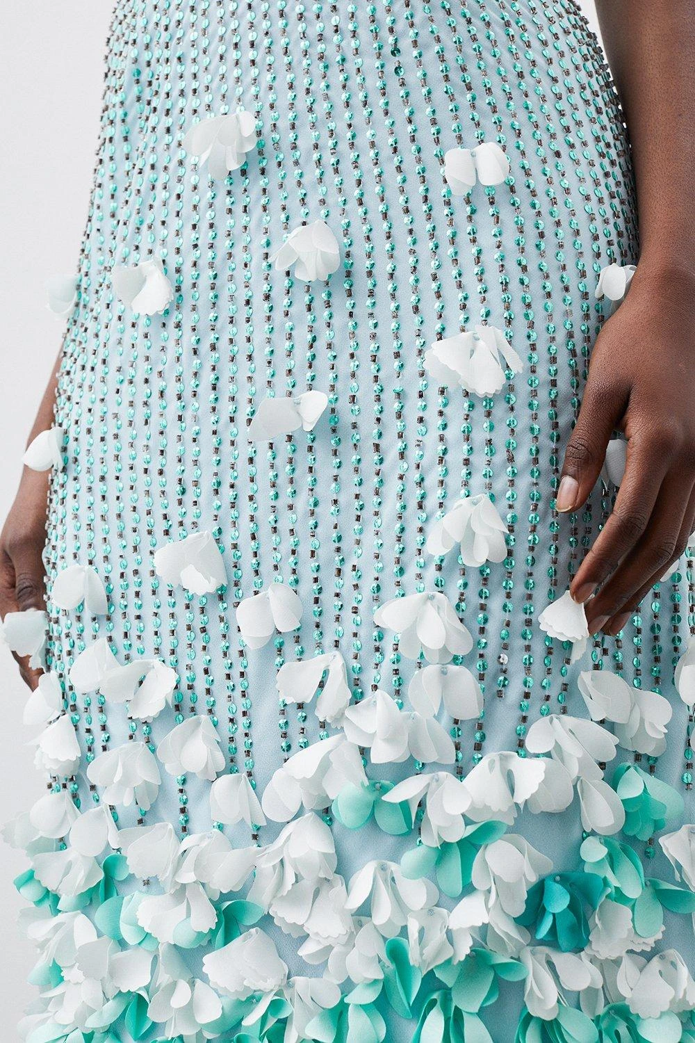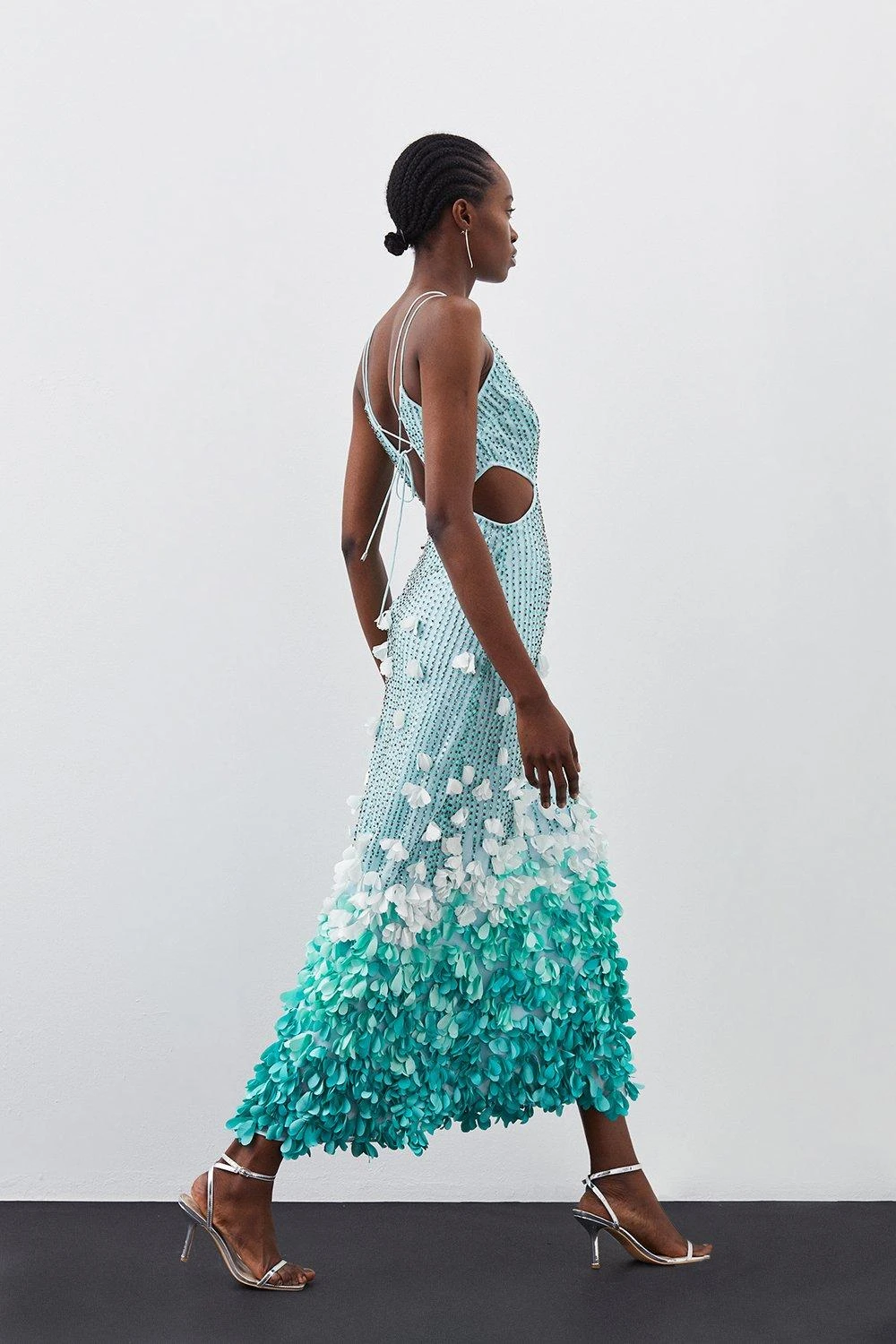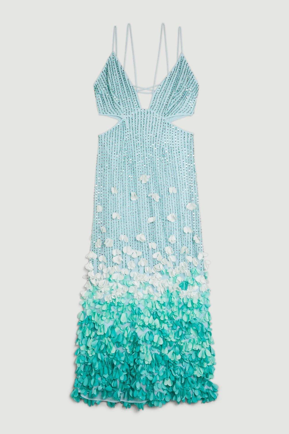 This flowing maxi dress boasts gleaming crystal embellishments and a cascade of applique petals dotting the skirt. Two sets of slim straps frame the neckline, accentuating edgy side cut-outs and an open back. Anchor the feminine palette and elegant embellishments with dramatic drop earrings.