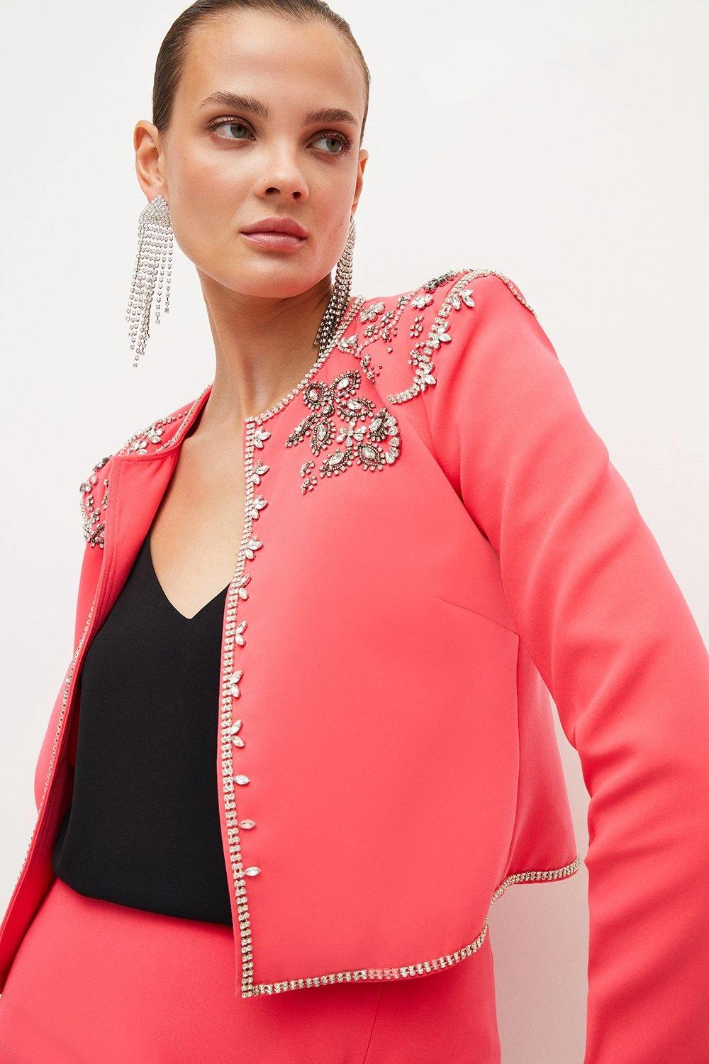 Heavy embellishment adds intricate edge to this softly structured cady jacket. Cut to a contemporary fit complete with boxy proportions and a collar-free neckline, it features glinting embellishments framing the shoulders, placket and cuffs for an undeniable sense of glamour. Team it with the matching fluted mini skirt for an ultra-feminine take on coordinated tailoring.