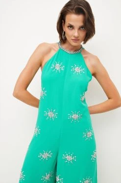 Detailed with sparkling sunbursts that glint beautifully in the sunlight, this vibrant jumpsuit is sure to stand out at summer weddings and sunset cocktail hours. It combines a crystal-embellished halter neckline with wide-leg trousers, shoulder-baring straps and a draped, curve-skimming fit. Match your footwear with the sparkling diamante clusters for a show-stopping finish.