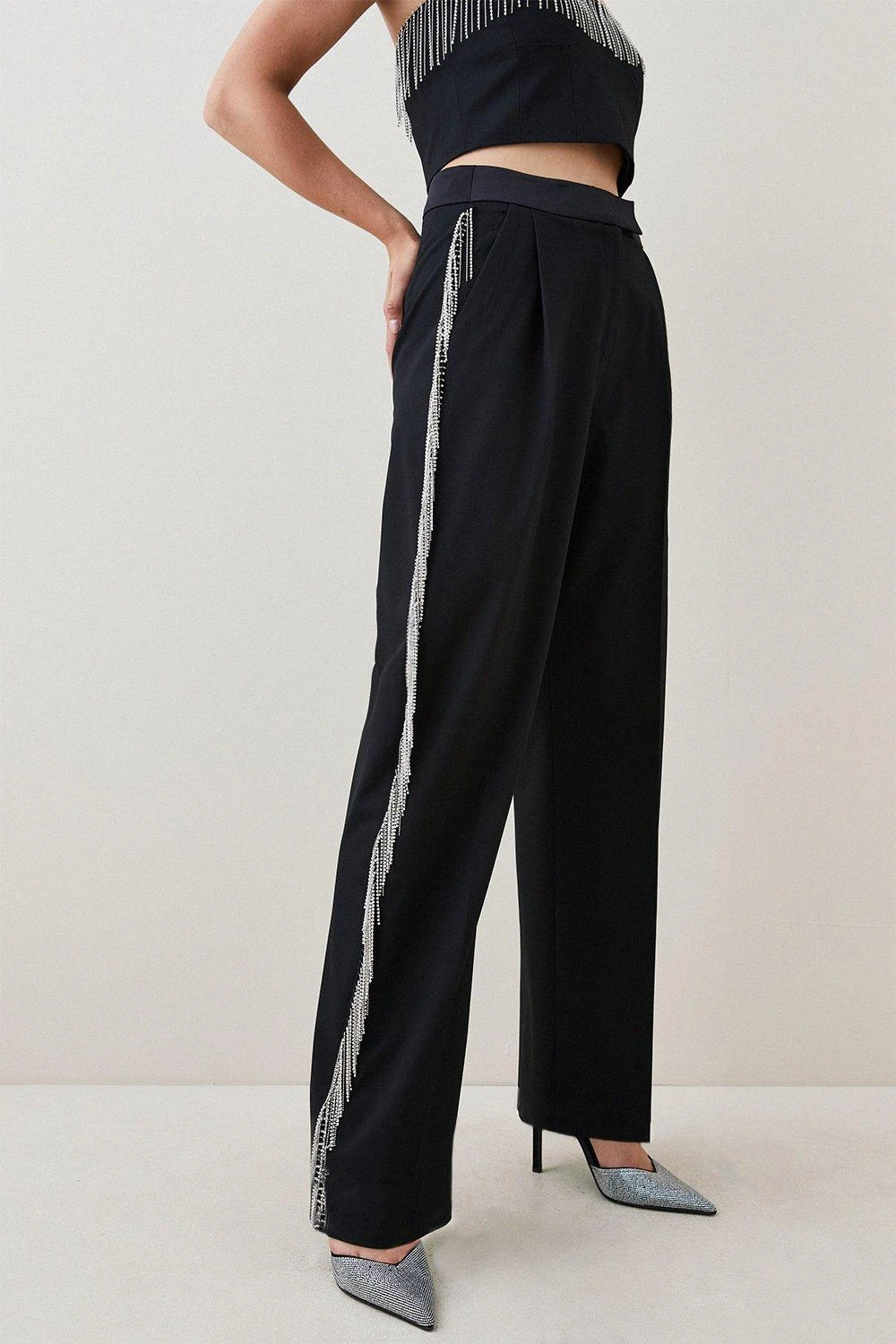 Fringed with crystal tassels, these opulent straight-leg trousers are sure to put a stylish swish in your step. Cut to a high-rise silhouette complete with zip and bar closure, they effortlessly enhance your form. Slip pockets and a relaxed fit add a sporty finishing touch.