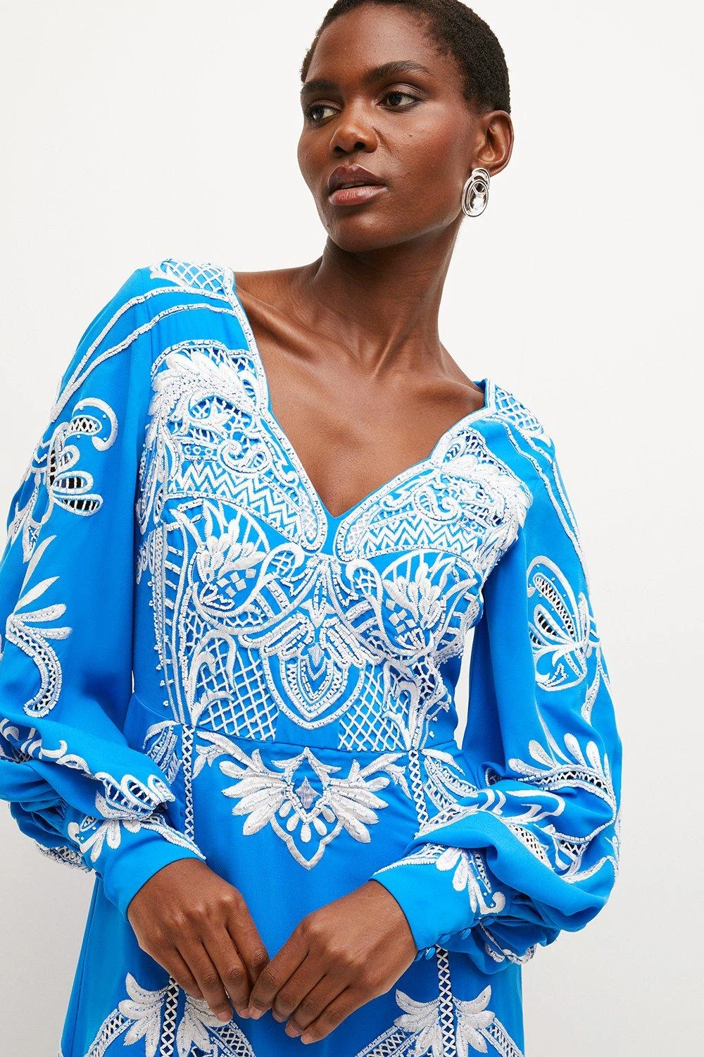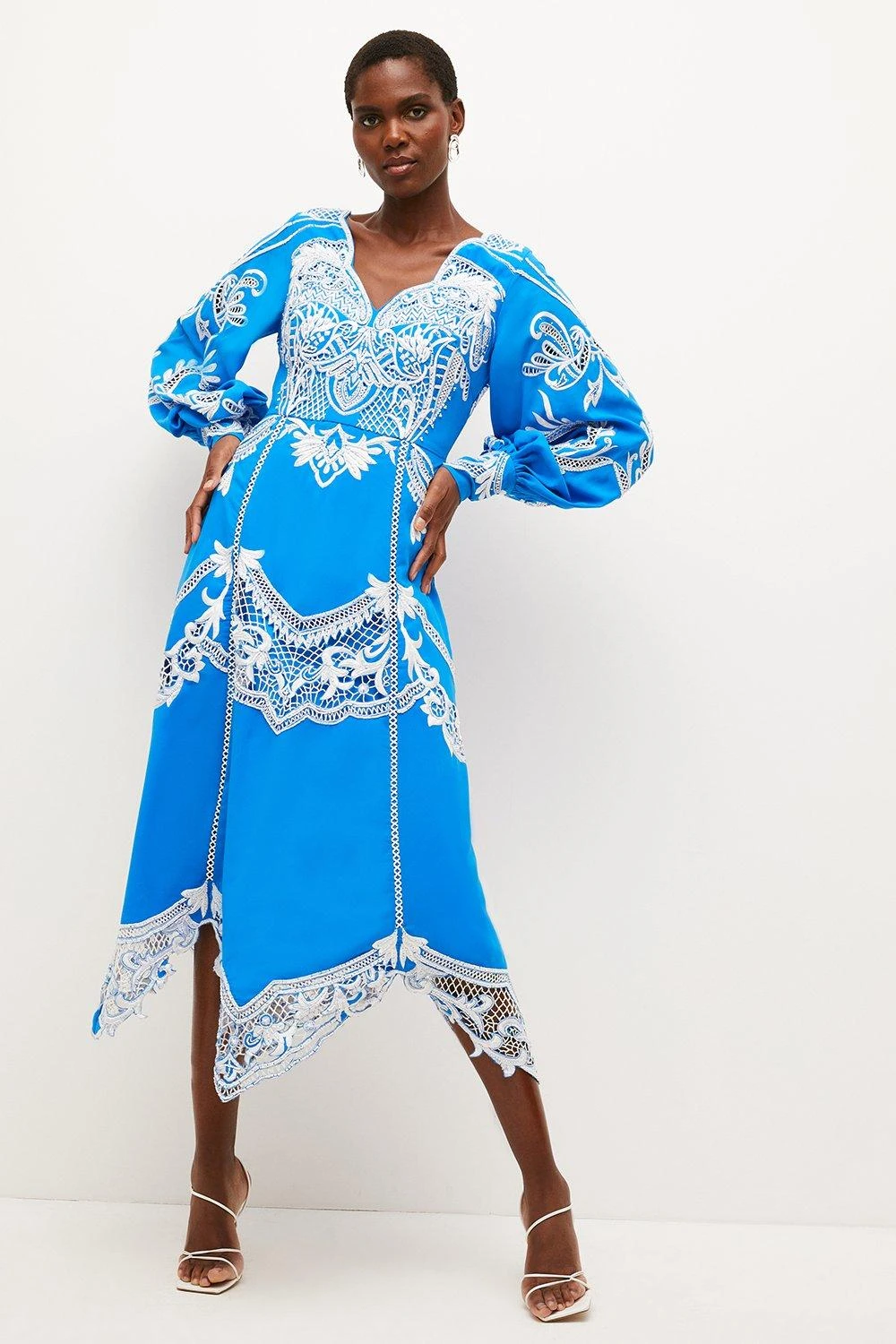 Defined by its intricate lace panels and opulent cutwork, this artisanal midi dress feels perfect for long, languid summer get-togethers. It boasts a romantic scalloped V-neckline, puffed sleeves and buttoned cuffs, offsetting a scalloped lace hem for a final romantic flourish.